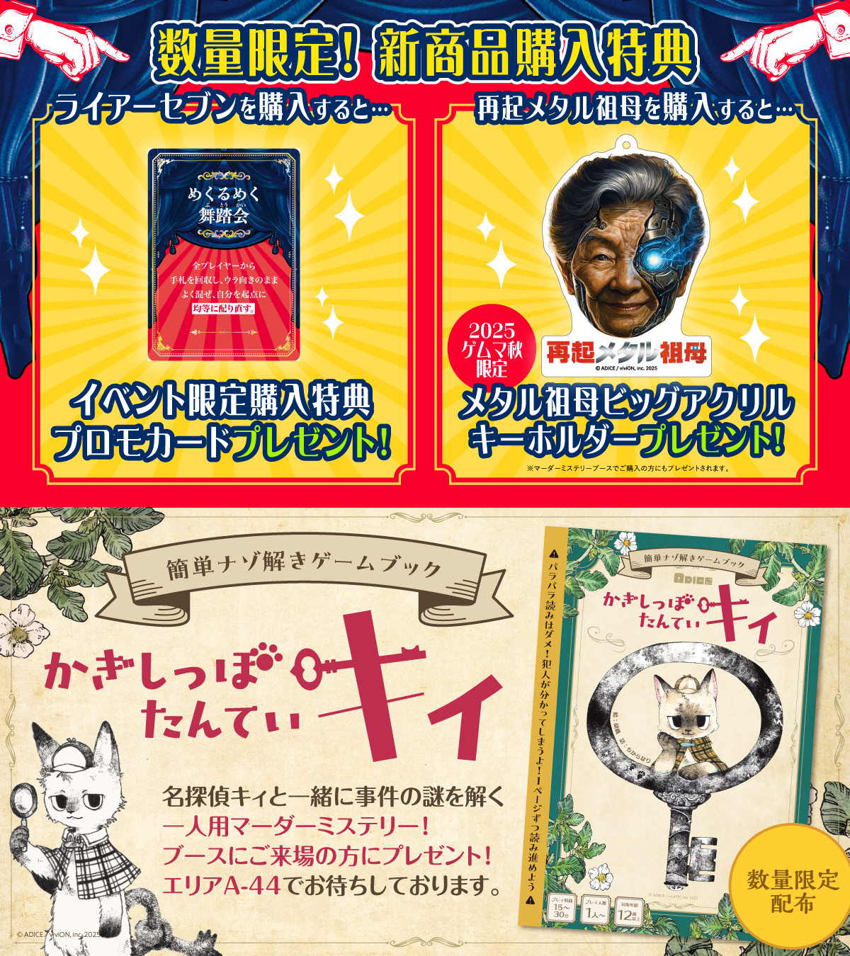 ゲームマーケット2025秋において、ADICEブース(エリアA-44)と、マーダーミステリーブースでの販売を予定しています。