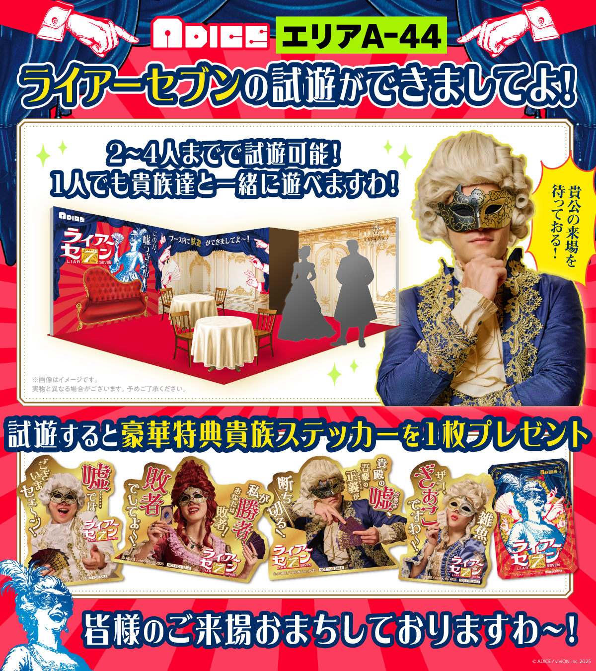 ゲームマーケット会場内のADICEブースでは、貴族に扮したスタッフが来場者をおもてなしいたします。ぜひ本作を試遊して優雅な貴族の駆け引きをご体験ください! 初対面の方とも、親しいご友人とも、遠慮なく「嘘つきですわ〜!」「お里が知れましてよ!」と言い合いましょう。