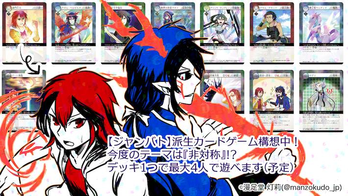 今までの作品『ジャンバト(じゃんけんカードゲーム)』『マコナラベ(カード配置&奪取)』の要素を混ぜた手ごわいカードゲームになりそうなのですが、