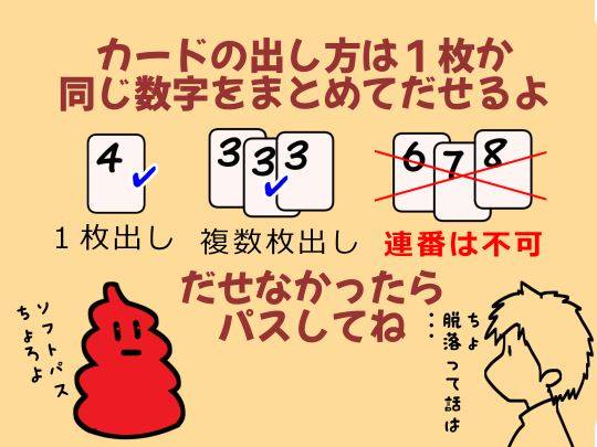 同じ枚数で数字を上げるか、枚数でちょうど1枚多ければ出せるよ