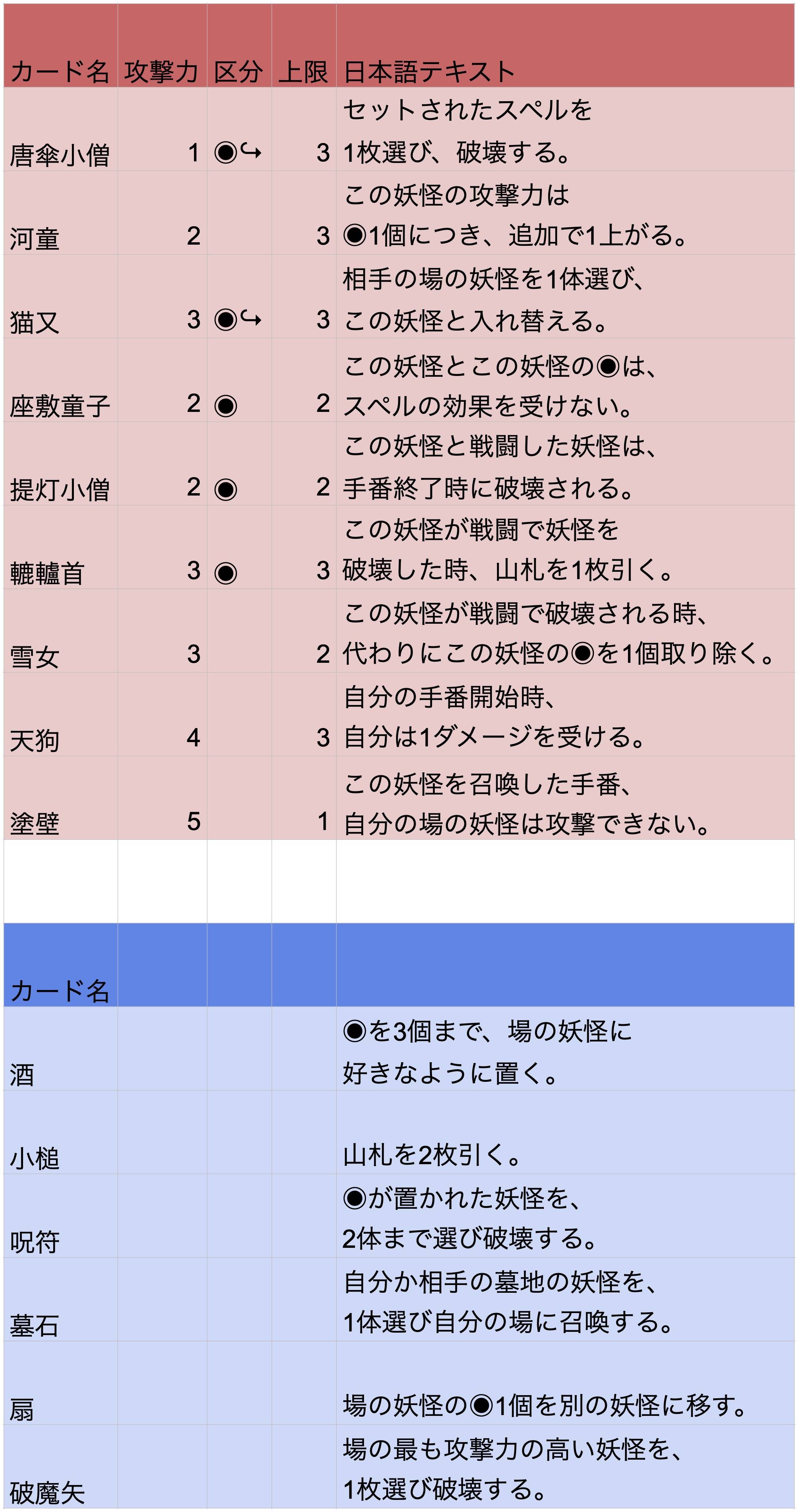 赤色の表が妖怪カード、青色の評価スペルカードとなっています。
