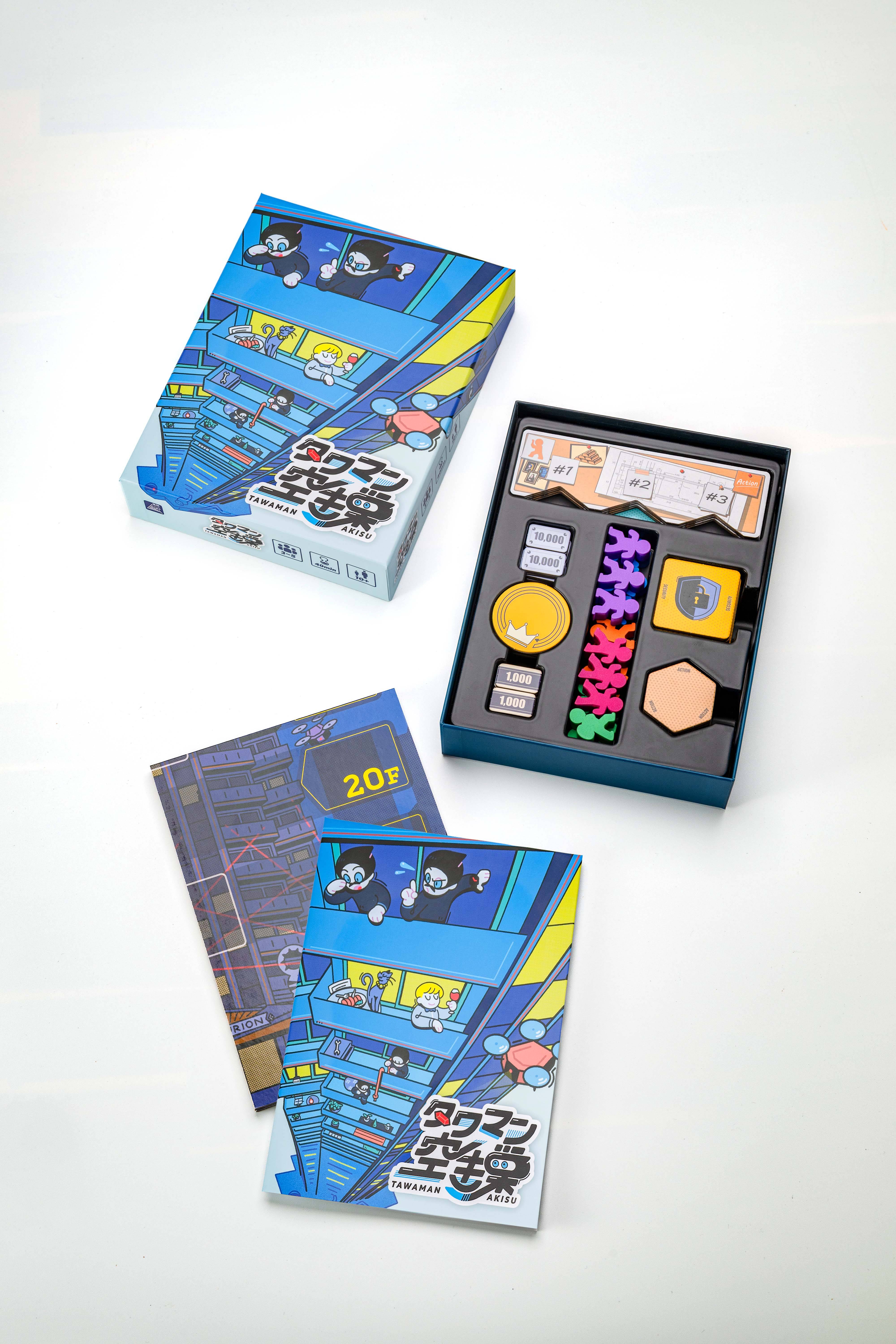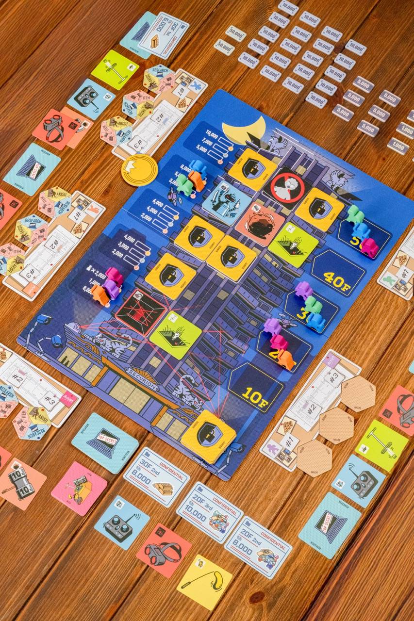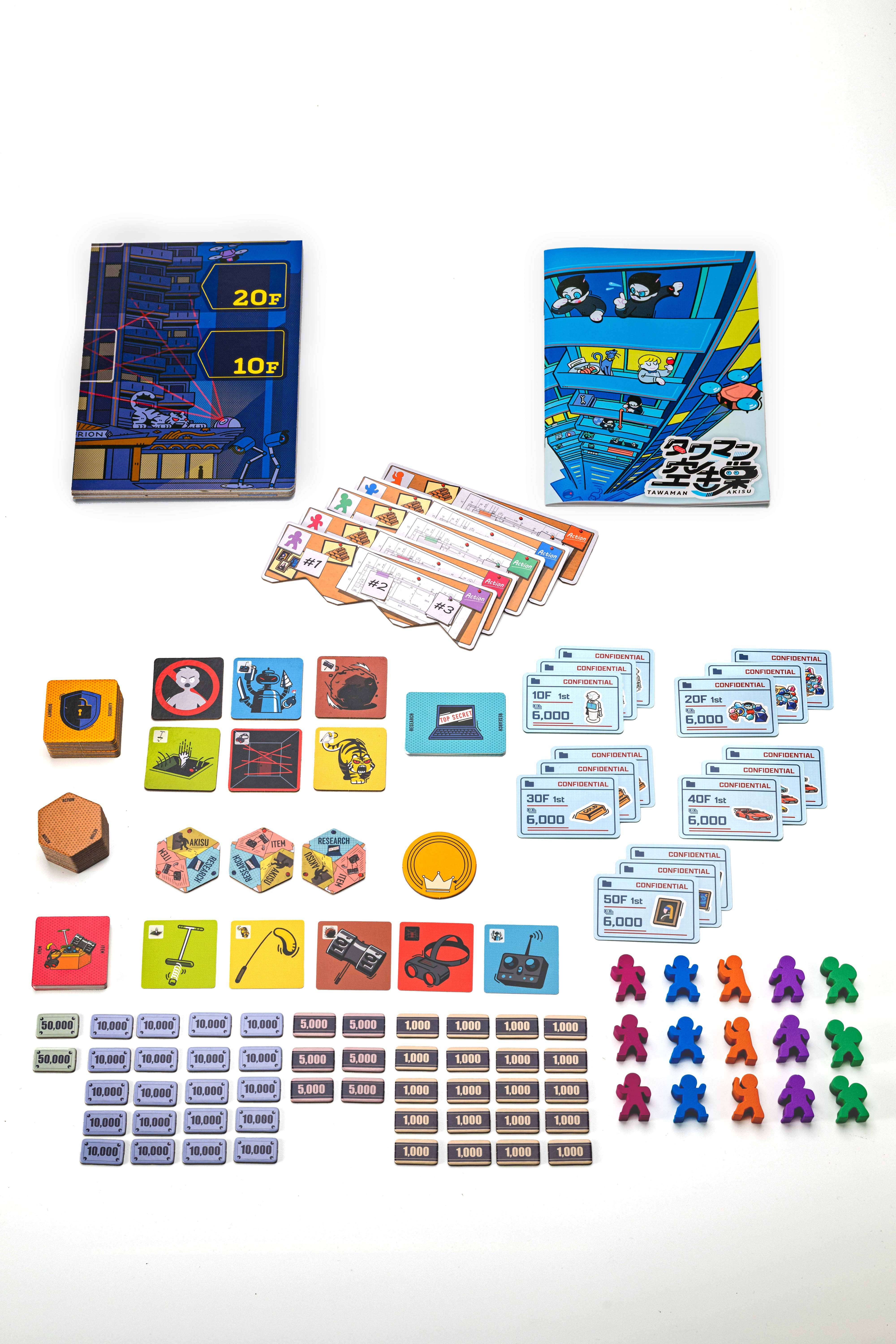 新作『タワマン空き巣』には、主戦場となるタワーマンションを描いたメインボードをはじめ、カード・タイル・コマなど全154点のコンポーネントが収録されています。