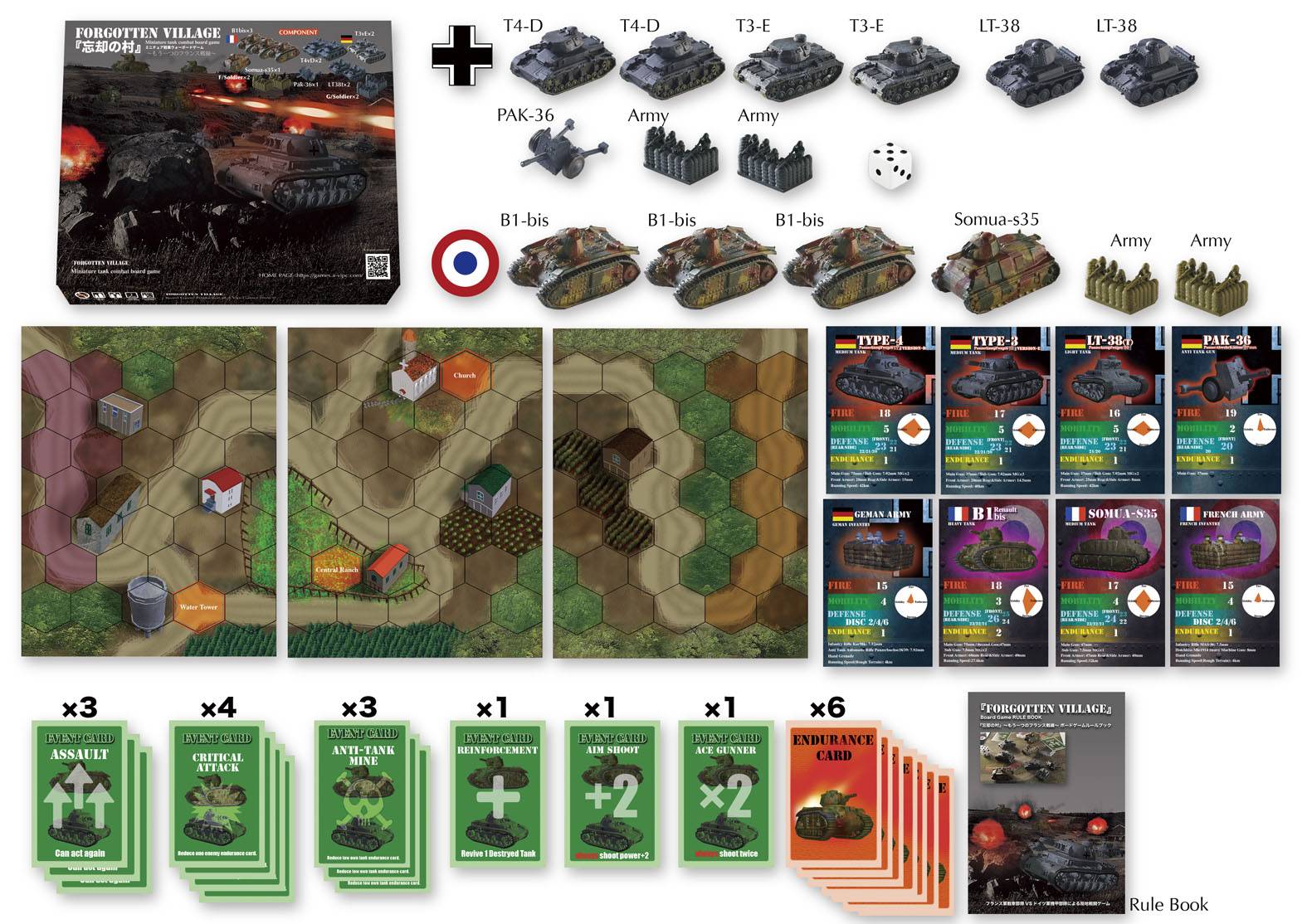 両軍のバランスが良いとは言えないとてもオタクなボードゲームです。あまりにも不利なドイツ軍の為にイベントカードをご用意しています。今回の新作で登場するドイツ軍4号戦車はD型で、史実ではこの村で破壊された写真も検索できましたので、当時の新型と言えども重戦車との戦いは壮絶だった事でしょう。テストプレーでは3号戦車と4号戦車の見分けが付かないと言う意見が・・(苦肉の策で、似ている3号戦車は、冬季のポーランド戦線から引き上げ転用されて来た車体と言う事で、やや冬季迷彩色塗装にしました)