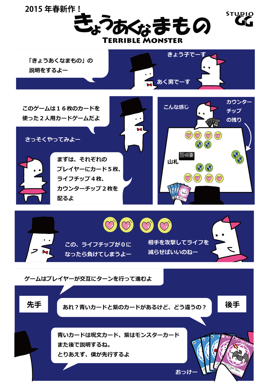 Studio GGはボードゲームデザイン担当のShunとディベロップ兼イラスト担当のAYAの二人で運営しているボードゲーム制作サークルです。 ・シンプルなルール ・ゲーマーにも楽しめる戦略性 ・ゆるいアートワーク を特徴とするボードゲームを制作しています。
