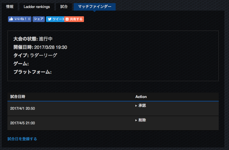 もしくは、自分が希望日時を指定して登録し、対戦相手からの申し込みを待つ。