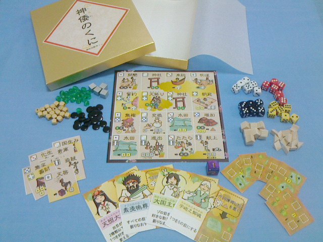 ![]() | 神倭のくに 【プレイ人数】 2~4人 【プ レイ時間】 20~40分 【ゲーム目的】 大神となって、配下の神(サイコロ)を上手く使って、地上を繁栄させる日本神話系ダイスワーカプレイスメント |