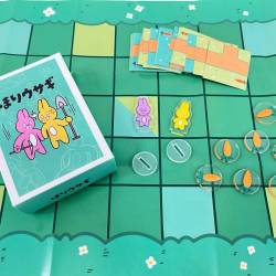 - 米光ゲームメカニクスラボの”へんなもの”です。今回、ゲムマ2025秋にリリースした『ほりウサギ』を紹介します! どんなゲーム?・5×7のマップ上でタイルを置き、コマを進めてチップを集める2人用対戦ゲーム・手番ごとに「タイル配置」「回転」「補充」の3つから行動を選ぶシンプル構成・マップ上の色付きマスに置かれたチップは、同じ色のタイルを置かないと獲得できない・ルールは素直だが、相手の進路や色の使いどころを読む駆け引きがしっかりある【ゲームの流れ】①マップ上にチップを配置し、各プレイヤーは手札3枚のタイルを引く②じゃんけんで先攻・後攻を決めたらゲームスタート!③手番では、以下のいずれかを選んで実行: ・タイルを1枚配置し、道がつながっていればコマを何マスでも進める ・相手がいる以外のタイルを任意に回転し、再び道に沿って移動 ・タイルを山札から引いて、手札が3枚になるまで補充④進んだマスにあるチップを獲得⑤すべてのチップがなくなったらゲーム終了、チップ数が多いプレイヤーの勝利! おすすめポイント・手番のたびに選べる行動が明確で、遊びやすい・初プレイでも直感的に理解できるコンポーネントとルール・大人同士でも、親子でも楽しめるちょうどいい思考量
