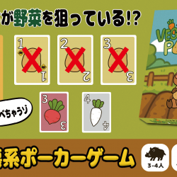 - ゲームマーケットまで、あと少し...!!当日販売するボードゲームを紹介します! ◇商品一覧①ベジタブルポーカー・・・1,000円 ➡役破壊ポーカーゲーム(詳細はこちら)②わん!・・・2.500円 ➡UNO系カードゲーム(詳細はこちら)③ロボファクトリー・・・3,000円 ➡心理セットコレクションゲーム(詳細はこちら)④蹴落としジャック・・・3,000円 ➡バッティングすごろくゲーム(詳細はこちら)⑤噓つきシンデレラ・・・3,000円 ➡ブラフカウントアップゲーム(詳細はこちら)⑥ドレマトペ・・・1,000円 ➡オノマトペかるたゲーム(詳細はこちら)⑦シュヴァインワンド・・・1,000円 ➡2人専用対戦カードゲーム(詳細はこちら) 試遊もできるので、ぜひ遊びに来てください!!