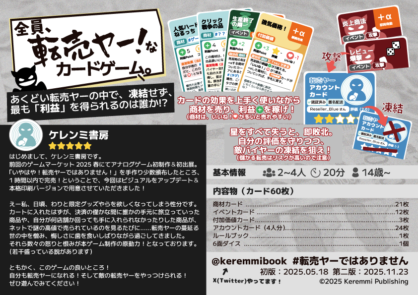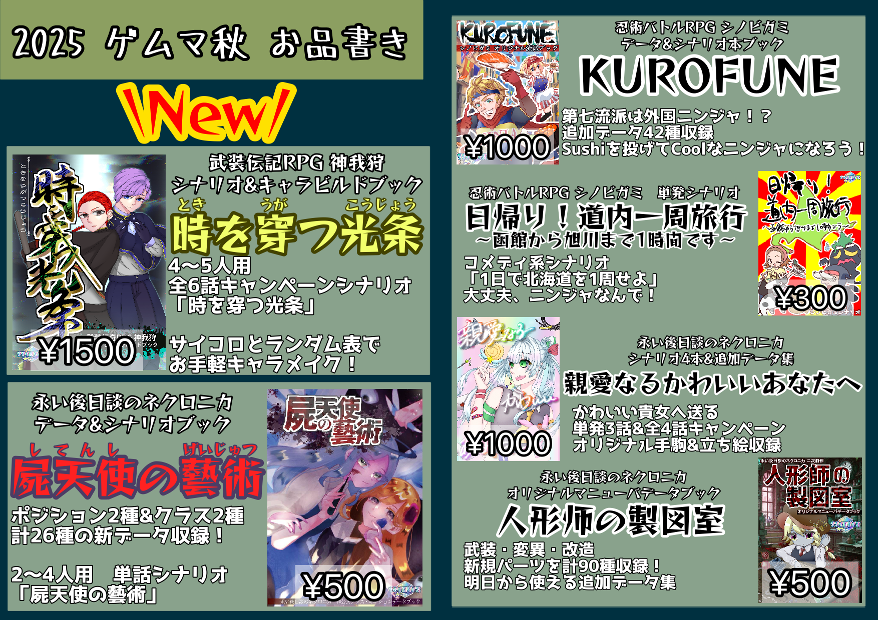 ゲームマーケットは2026年春にも参加を予定しておりますが、引き続き、販売可能な在庫などにつきましては自分のブログのリスト