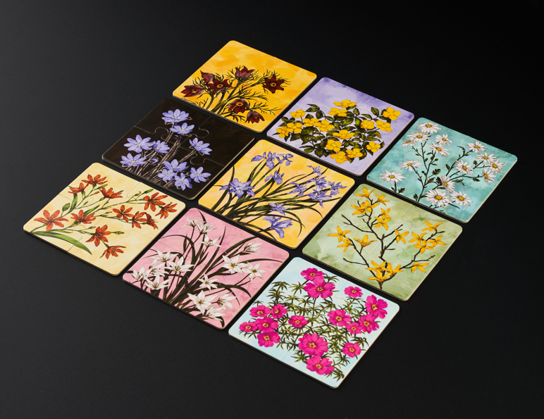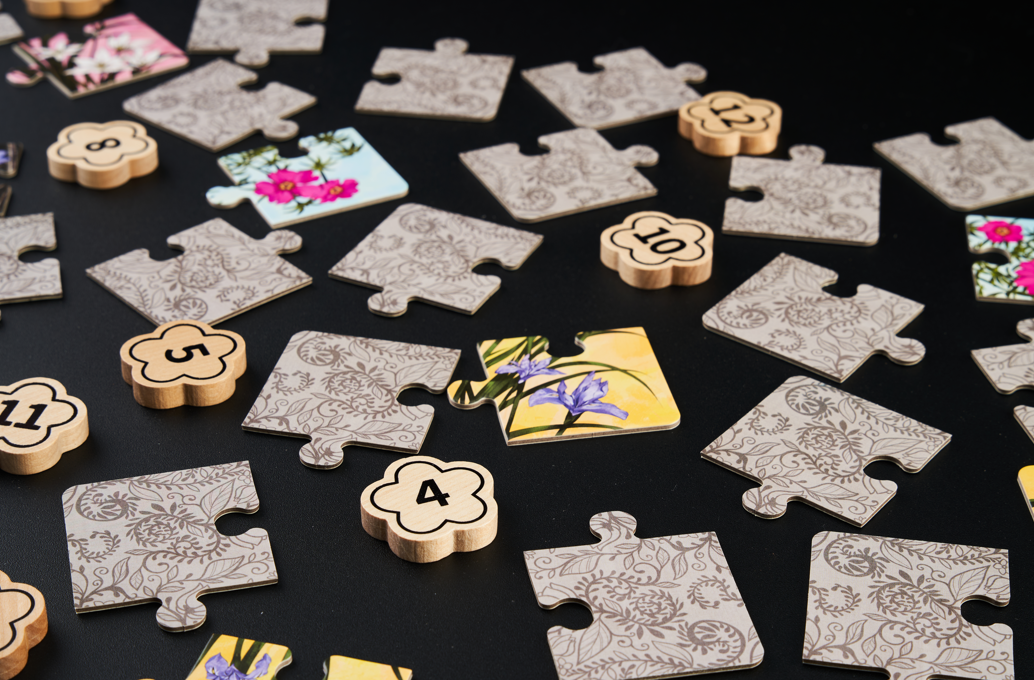 パズルのピースをすべてはがし、シャッフルしてテーブルの中央に裏向きで散らします。