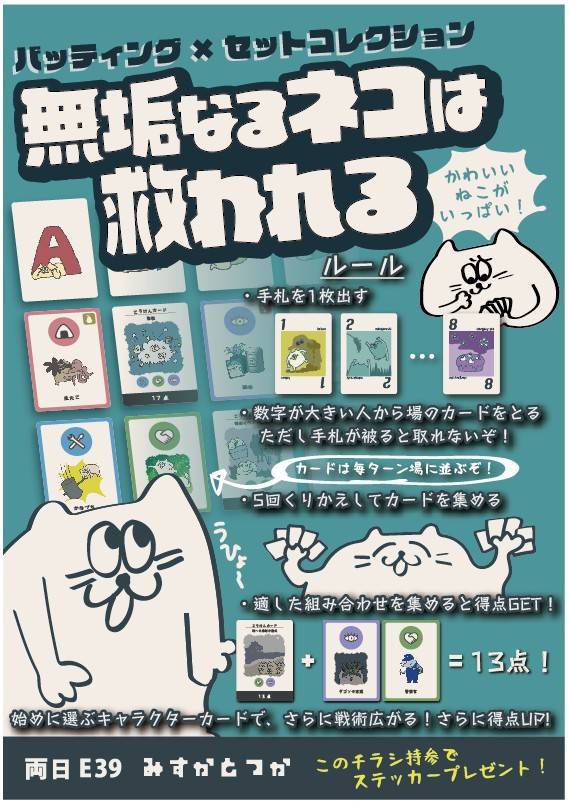 新作『無垢なるネコは救われる』を持っていきます!1ゲーム10分ながらしっかり読み合いがある心理戦ゲーム!