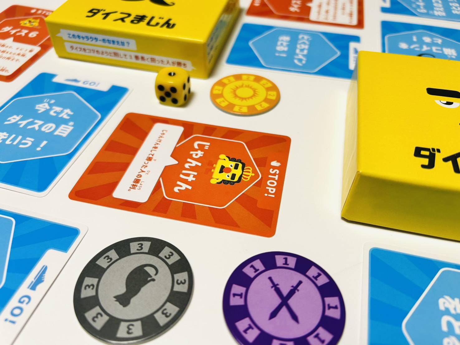 「ダイスまじん」はカードに書いてある様々なお題を行い、反射神経や知識を活かしつつ「ダイスまじん」と「にせダイスまじん」惑わされずにカードを1番多く集めたプレイヤーの勝利となるゲームです!
