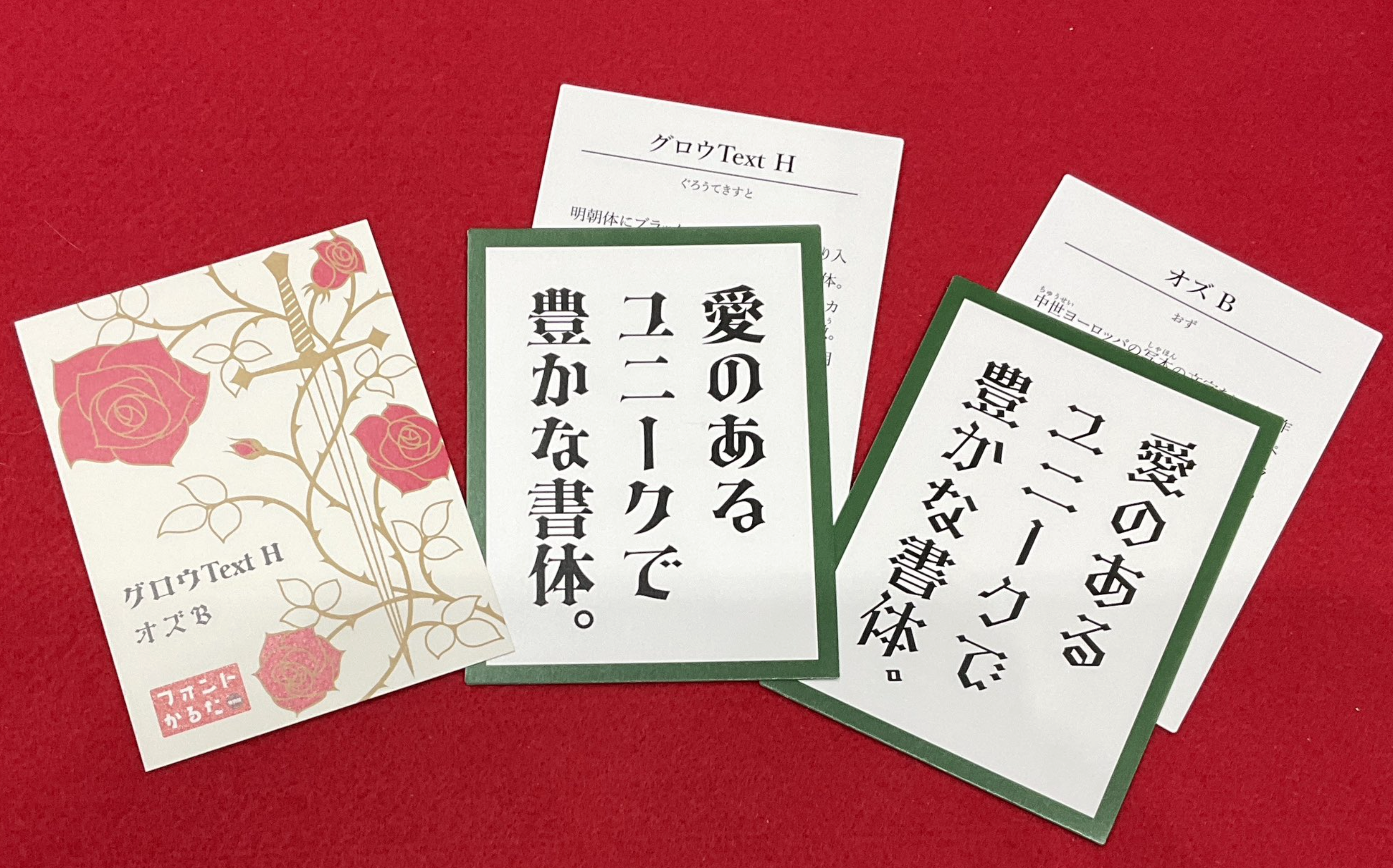 「グロウ Text H」「オズ B」2枚セットのノベルティが新登場です。Black Letterを思わせるこの2書体、『欧文版拡張パックBlack Letter』の発売をきっかけに制作しました。この秋のイベントでフォントかるたをお買い上げいただいた方に差し上げています。