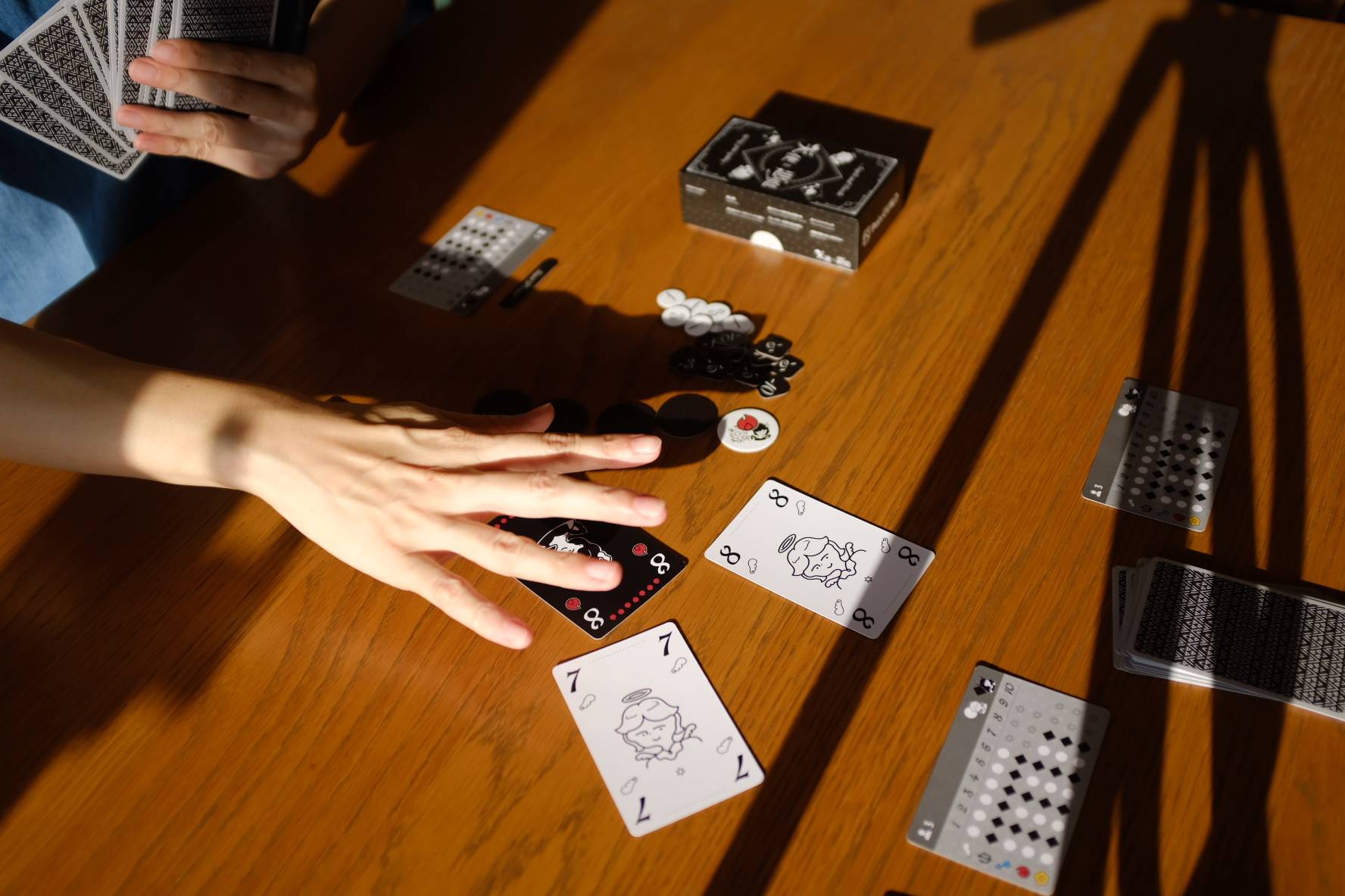 足し算・引き算と、3つの役カード(8切り・ゾロ目・同数)を駆使して 真ん中を取り合う