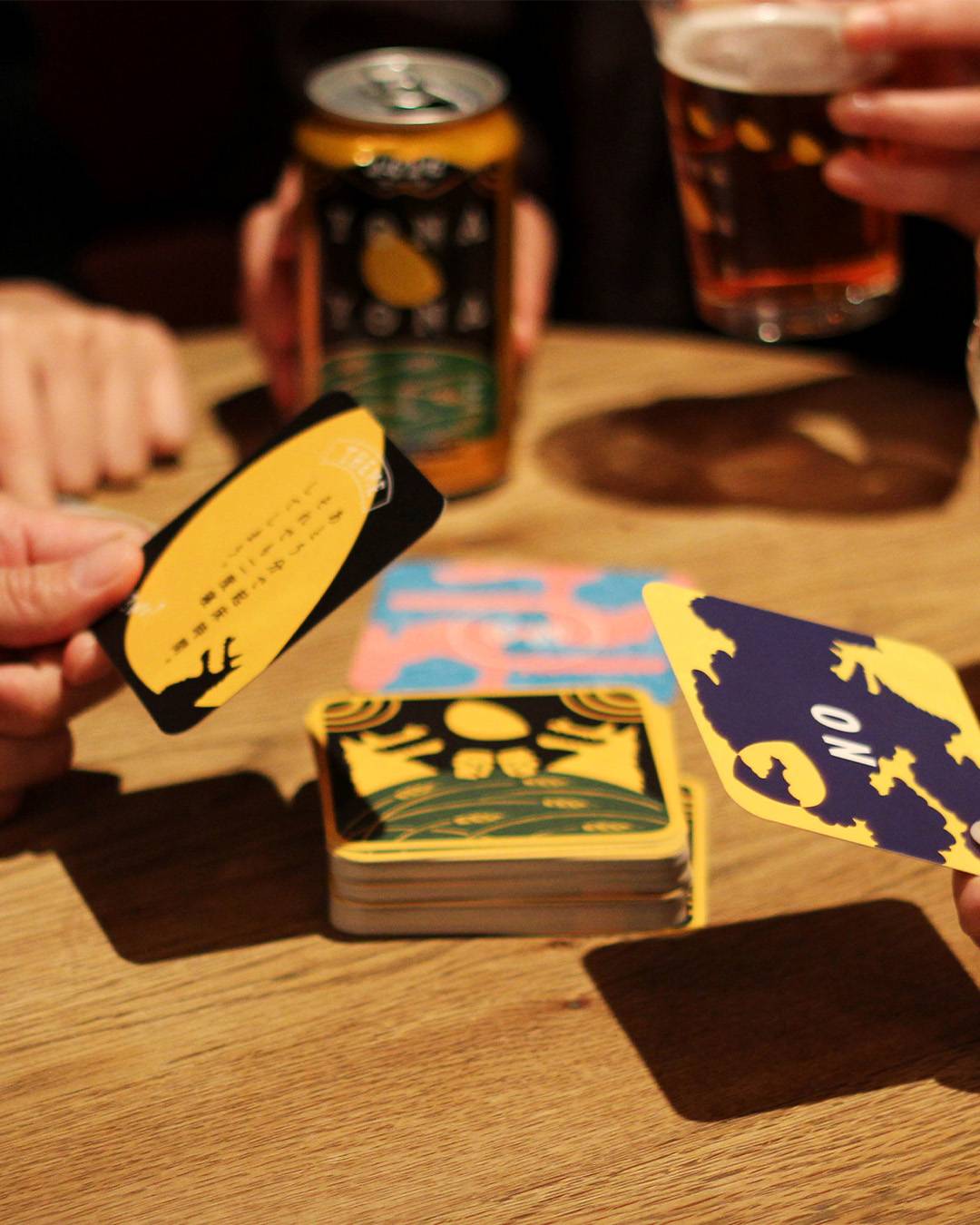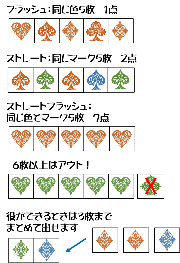 山を2つ作って最初の1枚を種札にします。番が来たら手札を3枚になるまで引きます。五つの色かマークを合わせて並べて役を作ると得点できます。でも、6つ以上並ぶとアウト!役を作るときは3枚まで、まとめてカードを出せ、斜めにも置けます。できた役の数だけ続けることができます。カードを置き間違えたら減点になります。得点の多い人が勝者となります。