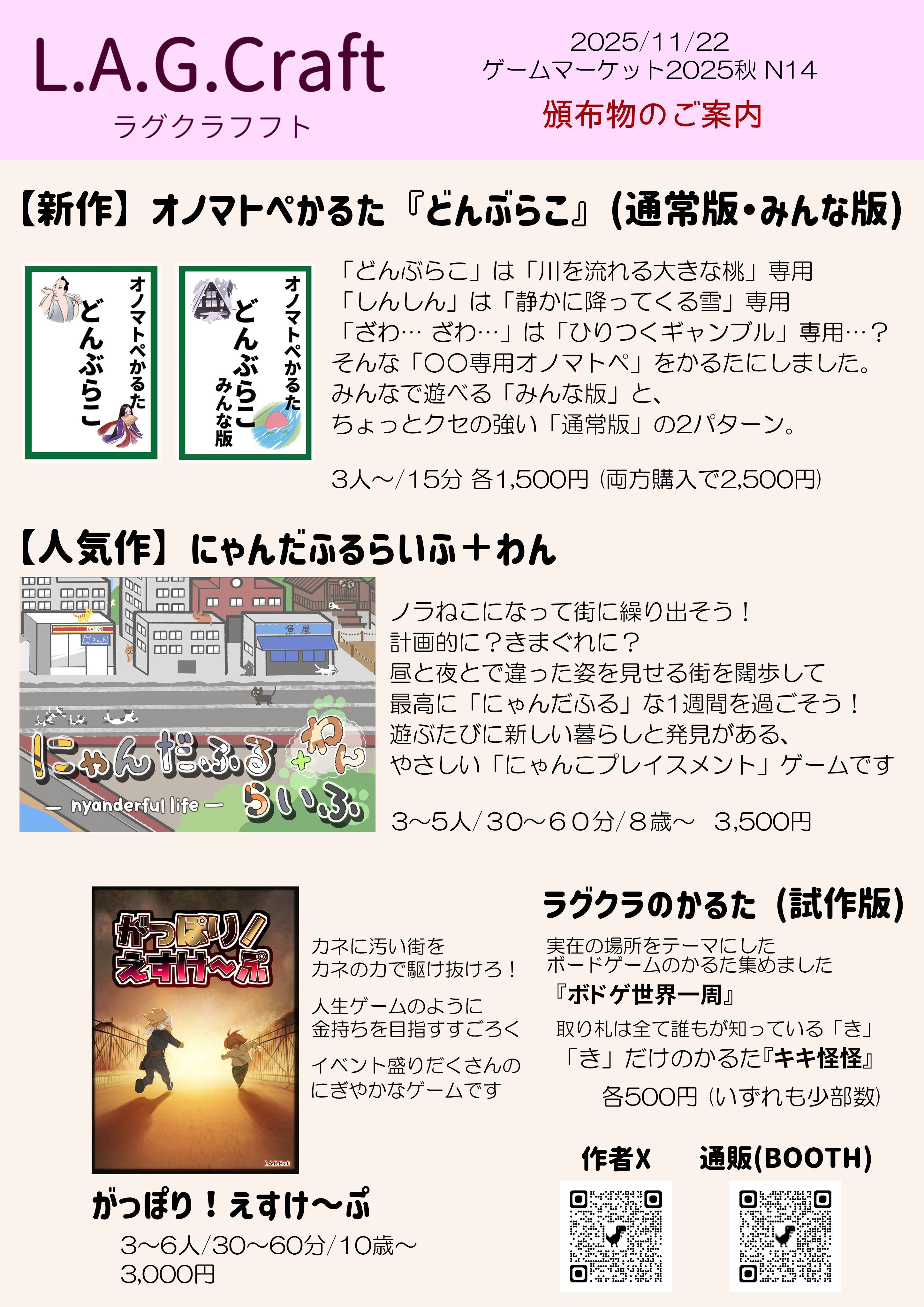 弊サークルL.A.G.Craftは、ゲームマーケット2025秋に土曜「N-14」にて出展します。