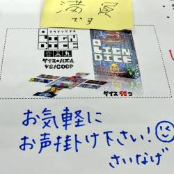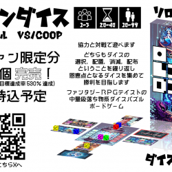 - アラインダイス皆様からたくさんご予約いただき取り置き予約終了となりました。ありがとうございます。当日は予約分のみの販売となります。予約受付には間に合わなかったのですが木駒SETをご用意いたしました。アラインダイスを華やかにするアイテムとなります。R-DRAGONのCASTLE CARDも付きます。頒布価格は1000円となります。是非併せてお買い求めください。申し訳ありませんが予約ありません。なくなり次第終了です。WOOD PIECES SET(木駒SET)内容物CASTLE CARD「R-DRAGON」モンスター木駒「DRAGON」「KRAKEN」「WEREWOLF」「MINOTAUR」「SKELETON」冒険者木駒「HUMAN(剣)」「ELF(杖)」「DWARF(斧)」以上クラファンで限定195個完売したダイス50個!対戦も協力も!パズル力とダイス運のRPG風ボードゲーム「アラインダイス」アラインダイスの詳細はこちらから