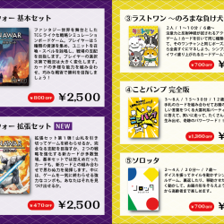 - こんにちは、BEYOND GAMESのありしんです。ゲームマーケットが近づいてきましたね!弊サークルは11/22(土)のみ出展となります。当日は【R22】BEYOND GAMESブースにて、新作2作を含む全5作品を頒布します。お品書きはこちら⇩ 今回は、過去作が少しお買い得な価格になっています。気になった作品があれば、ぜひブースに足を運んでみてください!予約フォームは⇨こちら ◾️各ゲームの公式サイトドミナウォー公式サイト⇨こちらラストワン公式サイト⇨こちらことバンプ公式サイト⇨こちらソロッタ公式サイト⇨こちら
