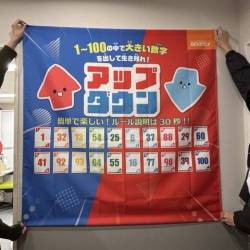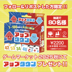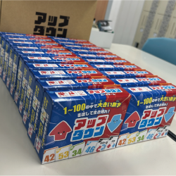- 先日、帝京大学の知育玩具研究会様が開催したイベントに出展してきました!たくさんの方にアップダウンを試遊していただき、大盛り上がり!シンプルでわかりやすく、みんなでワイワイ楽しめるゲームです!いきなり大きい数字を出したりする人もいれば、徐々に数字を積み上げていく人も。いきなり100を出した人はリバースカードを出され自爆していました_(┐「ε:)_これがこのゲームの面白いポイント!非常に楽しい会となりました。来場してくださった方々には感謝しております^^【追記】ゲムマでアップダウン80個配布キャンペーンを実施中!ぜひ公式Xより応募くださいませ!