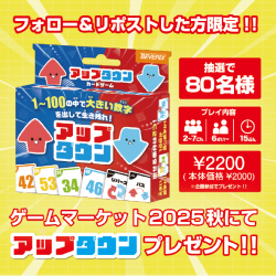 - ゲムマ先行発売予定のアップダウンを、なんとなんと80名に会場でお渡しする抽選会を実施しております!!ぜひこの機会にご参加くださいませ〜٩( 'ω' )وオリャー---【アップダウンとは】 上がるか⁉ 下がるか⁉ 1〜100の中で「大きい数字」または「一桁が同じ数字」を出して生き残る、 子どもから大人まで楽しめるファミリーカードゲームです。---【簡単なルール】❶ じゃんけんで親を決め、勝った人が全員に5枚ずつカードを配ります。 ❷ 親から時計回りでゲームスタート。手札からカードを1枚出し、山札から1枚引きます。 ❸ 前のカードより大きい数字、または一桁が同じ数字のカードを出せます。❹ 出せなくなった人から脱落し、最後まで残ったプレイヤーが勝利!---商品ページ→https://be-en.co.jp/products/tra-094?_pos=1&_sid=26e8996a9&_ss=r 遊んでみた動画→ https://youtu.be/vfqewNMEGR4---