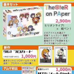 - プレイ人数:1〜♾️ (シートが有るだけ) プレイ時間:30〜60分(+インスト) 対象年齢:10歳以上 ゲムマ頒布価格:2500円(初出時) The@teR on PAper はミリオンスターズ!の39人をプロデュースしながら、他のプロデューサー(P)よりも優れたライブを競う紙ペンゲームです。 各Pは毎ラウンド5ユニットまでピックアップされたアイドルから1ユニットを選び、営業・レッスン・覚醒のうち2つを選んでプロデュースします。 営業ではファンとマニーが増加し、レッスンでは各ユニットのレッスンゲージが増え、覚醒したアイドルはライブ時のライブパワーを増やしたり、追加行動ができるジュエルをもたらします。 ゲームは9ラウンド行い、最終ラウンド終了後にアイドルのトレンドが定まった上で、各ユニットのライブパワーとレッスンに満足したファンの掛け合わせで得点が決まります。 先を見越した計画性と、トレンドを見極める判断力が、良いプロデュースの鍵。推しのユニットを誰よりも育て、うまくトレンドに乗った瞬間が熱いゲームです。 果たして、一番ファンを満足させられるPにあなたはなれるでしょうか?