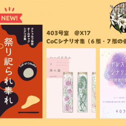 - いつもお世話になっております。 今年の秋ゲムマには403号室は出展致しませんが、昨年出した合同誌に掲載していた「ミルタの娘」を無料公開予定です。 他の作品は各作者さんの扱いによりますので、各作者さんのアナウンスをご確認ください。 また、11月頭に行われるオンライン即売会に403号室は出展致します。 Boothにて各作品の取り扱いを行いますので、よろしければご利用ください。 https://sshiou222.booth.pm/ 11月2日夜よりクトゥルフ神話TRPGシナリオ集を新たに頒布開始します。 今後ともよろしくお願い致します。