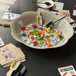 - モノビーズです。10歳さらがゲームを作っています。 さらは8歳の時にゲームを作り始め、ピスタチオの殻を使った「ピスタワード」でゲームマーケット2023春に初出展しました。 それから「マーブルワード」「カザリマスツリー」に続き、2024春新作「大行列」を作りました。 将棋の代わりにミープルを使った山崩し×セットコレクションです。 「大行列」はゲムマの事前試遊会フォアシュピールの投票企画、フォアシュピアクションで1位になり、 頒布前からたくさんの方に遊んで頂きました! 感想をまとめたのでよろしければご覧ください。 https://min.togetter.com/R7NGvcV さらは5歳くらいから母と一緒にゲームマーケットに一般参加していました。 各ブースで、作者さんから直接インストを受けて試遊したり、お話を聞いたりするのが楽しい、作家さんとの距離が近いイベント。 毎回楽しみに通ううちに、出展側への憧れを抱き始めました。 当時のゲムマでは小さい子どもが遊べるゲームが限られていて、面白そうだなと思って見ていても、 大人の方に混じって試遊するのは気が引ける場面もあったので、 「私もゲームを作って出展者になりたいな。子どもにたくさん試遊に来てもらえるブースにしたい」と さらが言い出したのが、ゲムマ出展のきっかけです。 それからピスタワードが生まれ、2023秋、2024春と3回目の出展を果たすことになりますが、 さらの「ゲムマに来てくれる子どもたちと遊びたい」という希望により、必ず試遊ブースにしています。 座ってゆっくりゲームを体験して頂けます。 今回、事前試遊会フォアシュピールの投票企画で1位を頂いたので、予約は早期終了とさせて頂きましたが 「当日遊んでから決めてくれるお客さんの分を取っておきたい!」 というさらの意見で、当日分もかなり確保してあります。 「大行列」は誰でもルールがわかるシンプルなアクションゲームでありながら、 トイレに並ぶルールやプールに飛び込むルールなど、戦略的な面もあり、 ファミリーからゲーマーまで一緒に楽しんで頂けるゲームです! 是非日曜のC-20にお立ち寄り頂き、さらと一緒に「大行列」を遊んで頂けたら嬉しいです。 お会いできるのを楽しみにしています!