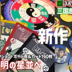 - 三国志専門店「英傑群像」 ゲームマーケット2025秋に新作3つ新発売します! 土曜日P07 ★共に三国志知識は不要なので友達や家族と遊びやすい! ①奇門遁甲テーマの花札的に役を3つ作る本格セットコレクション「諸葛孔明の星並べ」「諸葛孔明の星並べ」ルール動画「諸葛孔明の星並べ」詳細https: しょう ②1枚出しあって強さを比べあい領土をとりあう 「トリプル三国志」に追加で入れて遊ぶ トリプル三国志「仙人」拡張カード※「トリプル三国志」本体必要 今回同時販売します 「トリプル三国志」ルール動画 「トリプル三国志」詳細「トリプル三国志」拡張の詳細 ③Q's gamesさんの「トリバーシ」とのコラボ 武将タイルに勝利点高めな設定をした3人用リバーシ「三国志トリバーシ 」 「三国志トリバーシ」詳細はこちら ■すべてのご予約はこちら