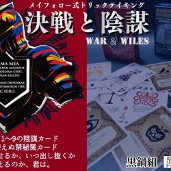 - 2025秋ゲームマーケット新作 『決戦と陰謀』になります今作はメイフォロー式トリックテイキングを基本とし、カードを駆使し10点先取で勝利となります。カードは2種類あり手札となる4スート1~9の『陰謀カード』ゲーム中1度しか使えない『禁秘策カード』があります。陰謀カードには このようにカード名・数字・スート・効果・即時/決戦時アイコンが描かれておりリードスートの場合はただの数字のカードですが、リードスート以外のカードを出すと効果が発揮されるという仕組みになっておりますこの例で出したカードをリード以外で出した場合即座に数字の強さが小さいほうが強くなります。次に禁秘策カードこれはゲーム中に1度しかプレイできませんが効果が大きいカードとなります陰謀カードをプレイするときに一緒に使用します。早いものがちで使うとそのトリック中は他の人は禁秘策を使うことができませんし、ゲーム中そのカードが誰かほかの人に使われることもありません。ゲームのプレイヤーは世界を裏で操る人物の一人となり、4つのスートが示す国を裏で操りながらただ一人の世界の支配者となるのが目的です。リードスートでの勝負が表での戦で、リードスート以外で効果を適用しているときは裏で陰謀を張り巡らせていると考えてください1度しか使えない禁秘策は「あ、あれは人員と資材の関係で凍結されたあの作戦!?」みたいなものと思ってください上記設定により真の支配者を決める勝負のため最初に10点以上を得た人が一人の場合だけ勝者になれます。ゆえに11点取っていても誰かが10点を取っている場合は今回はこの世界を一人で支配することはできませんでしたと言うことで勝者無しになります決戦と陰謀War and Wiles – 黒鍋組詳しいルールやカード説明は黒鍋組のサイトを見てください