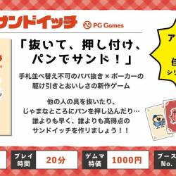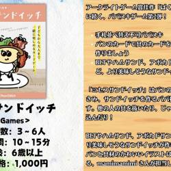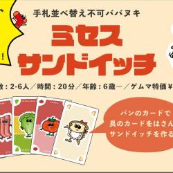- PGGames新作『ミセスサンドイッチ』を11/1-2の世田谷パン祭りにて遊んでいただいています!親子連れの皆さまにたくさん遊んでいただいたので、プレイの様子を公開します。実際に遊んでみた際のイメージを持っていただけると思うのでぜひご覧ください!可愛いカードにもご注目! 本日も世田谷パン祭り内、『HOME/WORK VILLAGE』にて遊べますのでお近くの方などぜひいらしてください!アークライトゲーム賞佳作「ぼくのくつしたどこいった」に続く、ババヌキゲーム第2弾!「ミセスサンドイッチ」はパンのカードで具のカードをはさみ、サンドイッチを作るババ抜き風のカードゲームです。他の人の具を抜いたり、じゃまなところにパンを押し込んだり! BLTやハムサンド、アボカドサンドやサバサンドなど、より美味しそうなサンドイッチが作れると高得点です。パンと具材のかわいいイラストは顔はめ似顔絵も描いている、mamimamimi さんが担当しています。1ゲーム10分から15分程度で遊べます。かんたんなので、お子さまも一緒に遊べるよ!対象年齢:6歳〜ゲムマ特別価格 :1,000円所要時間:10-15分 🥪取置予約https://forms.gle/R4xCmgJZ2JGqc5UB6🥪通販予約https://paix.booth.pm/items/7537048 🥪プレイ動画実際に『ミセスサンドイッチ』を遊んでみた動画です! 大まかなルールも分かるようになっているので、ぜひご覧ください。