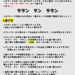 - 「ターミネーターのテーマ」を作るポーカー 説明書§イントロダクションこのゲームはポーカーをするゲームです。ただし役は1つしかありません。「ターミネーターのテーマ」という役です。つまり……デデン デン デデンこのフレーズを配られた手札と1度のカードの交換で完成させましょう!§遊び方このゲームは1~3人で遊ぶゲームです。1.山札となる30枚のカードをよく混ぜます2.プレイヤーは5枚のカードを山札から引きます。これは手札になります。3.プレイヤーは手札に書かれた文字を使って「デデン デン デデン」の文字列になるように並べ替えます。(並べ替える際は後述の §注意 のルールに従ってください)4.プレイヤーは1度だけ手札のカードを山札と交換することができます。 (交換しなくても良いです)5.捨てるカードの枚数を宣言し0~5枚のカードを捨て札にします。捨て札の内容は他のプレイヤーに見えないように伏せて置きます。6.プレイヤーは新たに山札から捨てた枚数ぶんカードを引きます。新たに引いたカードを手札に加えて、「デデン デン デデン」の文字列になるように並べ替えます。7.全員が並べ替えを終えたら公開(ショーダウン)します。「デデン デン デデン」の文字列になっていたら成功、成立していなければ失敗となります。8.成功したプレイヤー全員の勝利です。§注意①使わないカードがあっても成功です 良い手札なら3枚で役が完成します。②最初と最後に不要な文字があっても成功です 画像では「デデン デン デデ ンデン」の4枚のカードを使っています。役である「デデン デン デデン」の文字列が含まれているので成功です。また、このルールに則りカードには最初にしか使えないカード、最後にしか使えないカードが存在します。 ③他のカードで文字を隠してはいけません 画像では3枚目のカードを4枚目のカードで隠し、「デデン デン デデンデ」の文字列にしています。役である「デデン デン デデン」の文字列が含まれていますが、これは失敗扱いになります。