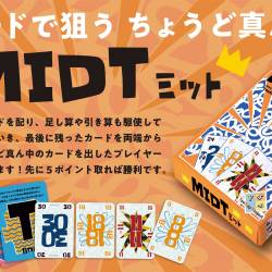 - 【MIDT】kickstarter715%達成🎉4月~5月に実施した『MIDT』のクラファンですが、レイトプレッジにて、2025年10月までご購入いただけます!!現在もご支援頂いております💕🌳🪵🌳CHILLTIMEのアドオン追加しました🌳🪵🌳オリジナルマット新色《ブラック》は完売中お買い得なメニューがありますのでお見逃しなく 👉https://www.kickstarter.com/projects/ysp/midt いつも応援ありがとうございます! — YouSayProject 🎲 👑【MIDT】ミットのルールをプロボドさんのYouTubeでご紹介いただきました🎉ルール解説動画 https://x.gd/rwoiy 先日、実際に 遊んで頂き、気に入って頂いたので大変光栄ですボードゲーム協会の 岩田会長、ボードゲームカフェONEの店長さこんさん、ありがとうございます【MIDT】通販開始しましたメロンブックスさんに続き、ボードゲーマさんでもご購入いただけるようになりました!!買いそびれたかは、在庫があるうちにGETしてちょ💕👑メロンブックスさんの全国の店舗(札幌~福岡)でもお買い求めいただけます👑【MIDT通販】≪メロンブックス≫https://x.gd/JRqIy≪ボードゲーマ≫https://x.gd/40xc7【CHILLTIME通販】≪ボードゲーマ≫https://x.gd/GXlza≪BOOTH≫https://x.gd/RltgQ🎉ゲムマ2025春 ご来場有難うございました 🎉 MIDTもCHILLTIMEも遊んだら是非ツイートして下さい ハッシュタグこちら #ボドゲMIDT#ボドゲチルもし、気に入って頂けたら、お手数ですが、レビューもお願いしますMIDT: https://x.gd/p4ynWCHILLTIME: https://x.gd/IpoRw 【MIDT】<概要> 2~4人用・対戦型・プレイ時間15分~足し算・引き算と、3つの役カード(8切り・ゾロ目・同数)を駆使して 真ん中を取り合うシンプルながら奥深いカードゲーム【特徴】〇頭を抱える面白さ計算、戦略、記憶、いろいろな方向から脳みそを駆使させられます。〇プレイはシンプルやることは、手番順に手札の数字カードを場に1枚出すだけ。場のカードは、数字の大小順に並べる。〇ルールが斬新最後の1枚は、全員一斉に出して、プレイ終了。場のカードの真ん中のカードを置いたプレイヤーはポイントGET。(場のカード枚数が、奇数時は、真ん中の1枚が3ポイント。 偶数時は真ん中の2枚がそれぞれ1ポイント。)(ガチバトルは5ポイント先取・ワイワイバトルは4ポイント先取)遊び方動画など、作品概要はコチラ↓https://gamemarket.jp/game/182795☆『MIDT』先行体験会レビュー☆【しばっちさんレビュー】↓(ルール解説&感想)https://note.com/ra_shibao/n/n66a6d7525885【こぱんさんレビュー】↓(簡潔に遊んだ感想まとめ)https ://note.com/kkopan397/n/nde5105572f71【先行体験感想他まとめ】https://togetter.com/li/2339588📣 ゲムマでは新色・黒マットも登場!MIDTの世界を、スタイリッシュに遊びつくそう!グッズが在庫少なめなので、お早めにいらしてくださいね🎉👑オリジナルブラックマット あと9枚グレイと比較してこんな感じの色です👇 【CHILLTIME】もあるよ☕👑【今後のイベント】🏆 CHILLTIME世界大会予選(満員)7/29(火)@表参道スプリングテラス👉 https://www.bear.cool/board-game/event/59504/info ※MIDTオリジナルマット 新色ブラック⇩ 『MIDT』のブログをご覧くださり、有難うございます!! ゲムマ2024春で即完売してしまったMIDTがゲムマ2025春に帰ってきます!! 英語の説明書を付けて、ゲムマ特価2500円にて販売予定です☆ ぜひご注目下さい!! 【2025春のお品書き】【CHILLTIME】森の奥深く 絶景の癒しスポットに 自分だけのロッジを建てろ!!<概要> 2人用・対戦型・プレイ時間35分~45分 ダイス×パズル×ピック&デリバリー【簡易説明動画】 https://x.gd/d6ruQU 【MIDTミット】