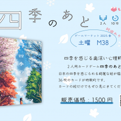 2025s 土 - M38 試遊○ いろどる @irodorukokoro 2人用対戦ゲーム「四季のあと」を2025春のゲームマーケットで販売決定! 試遊スペースもありますので、ぜひ遊びにきてください! 土曜 M38でお待ちしております! ブログを 12306090120 件ずつ表示しています ブログ一覧 おすすめ順新着順古い順 「四季のあと」ゲムマ春にて販売決定!ゲームマーケット2025春にて、2人用対戦カードゲーム「四季のあと」販売いたします!!当日は試遊もございますので、ぜひ遊びにきてください!詳しいルールはこちら予約はこちら 2025/4/28 13:02 いろどる 「四季のあと」ゲーム概要と公開こんにちは!ゲームマーケット2025春の新作「四季のあと」の作品概要を公開いたします。ゲームは非常にシンプルで手札2枚からどちらかを選んで場に出すだけ相手が出してくる季節が何かを読み合うこと、そして相手が持っているカードを記憶していくことの両方が試されます詳細なルールはこちら予約はこちら 2025/4/21 19:33 いろどる 「四季のあと」カードデザイン公開 「四季のあと」の数字1のカードデザインです〜絵柄にはこだわって制作しているので、ぜひカード絵だけでも見に来てください!!土曜 M-38でお待ちしております。予約フォームはこちら 2025/4/17 16:59 いろどる 「四季のあと」ゲムマ春にて販売決定!初めまして。今回2025春のゲームマーケットで初出展になります、いろどるです。 2人用対戦カードゲームの「四季のあと」の予約を開始いたしました。「四季のあと」は、奥深い心理戦が楽しめる2人用のゲームとなっております。詳しいルールはこちら 四季を感じられる美しいカード絵が特徴的です。ルールも単純ながら考えることが多く、記憶力と相手との駆け引きが重要です。 当日は試遊スペースもございますので、ぜひM-38まで遊びにきてください! 予約フォームはこちら 2025/4/15 23:39 いろどる