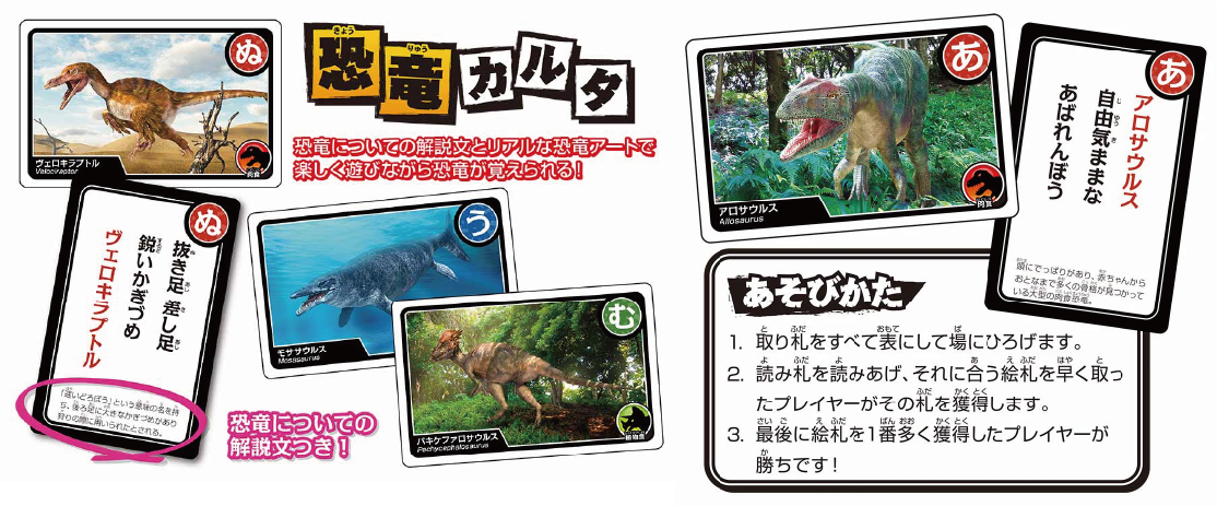 - 恐竜についての解説文とリアルな恐竜アートで、楽しく遊びながら恐竜が覚えられる!