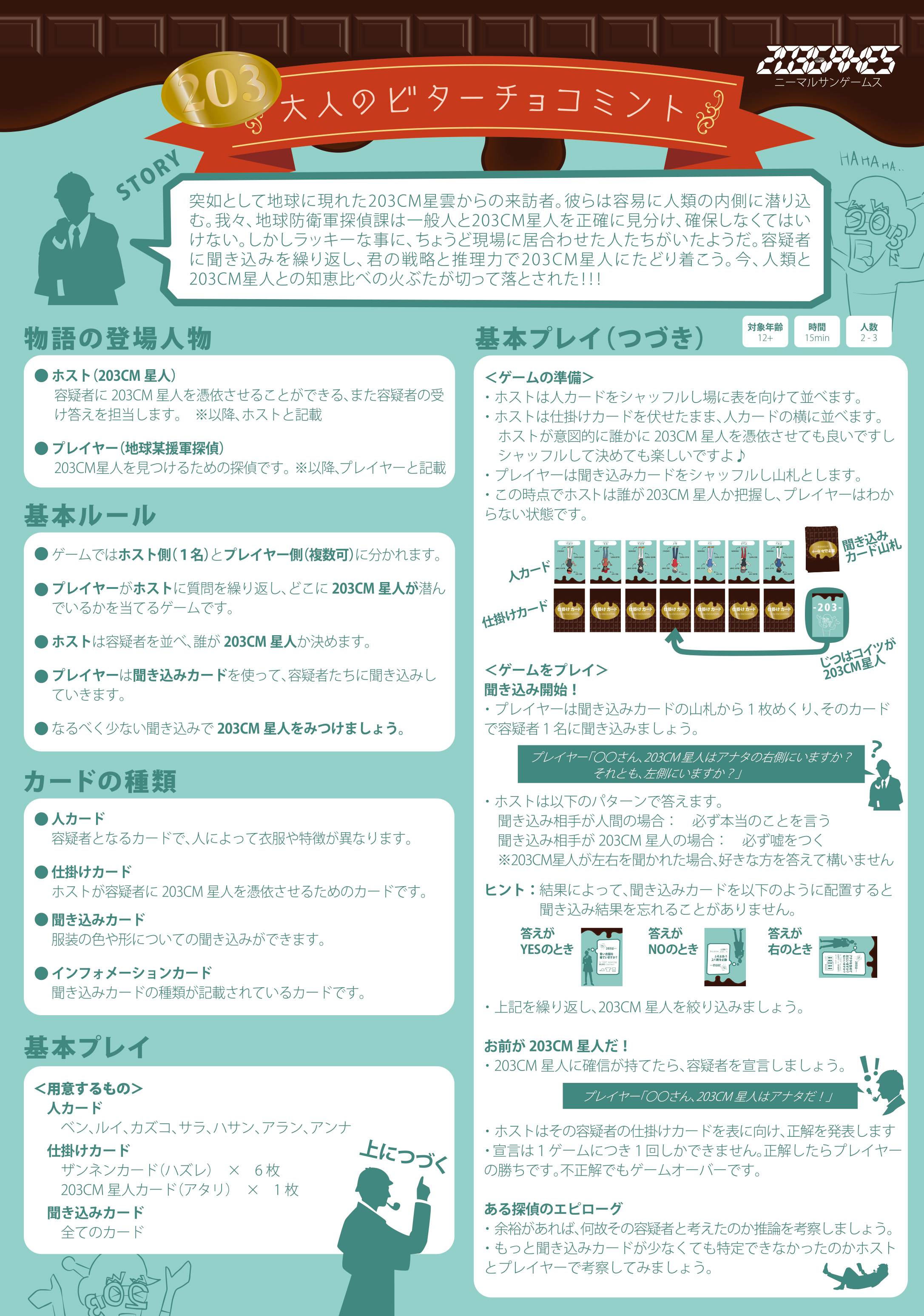 一般人に紛れこんだ203CM星人、見た目だとわからないけど、容疑者達にインタビューを繰り返し、見つけ出そう。ちょっぴり苦いオトナなチョコと清涼感のあるミントを意識したゲームです。