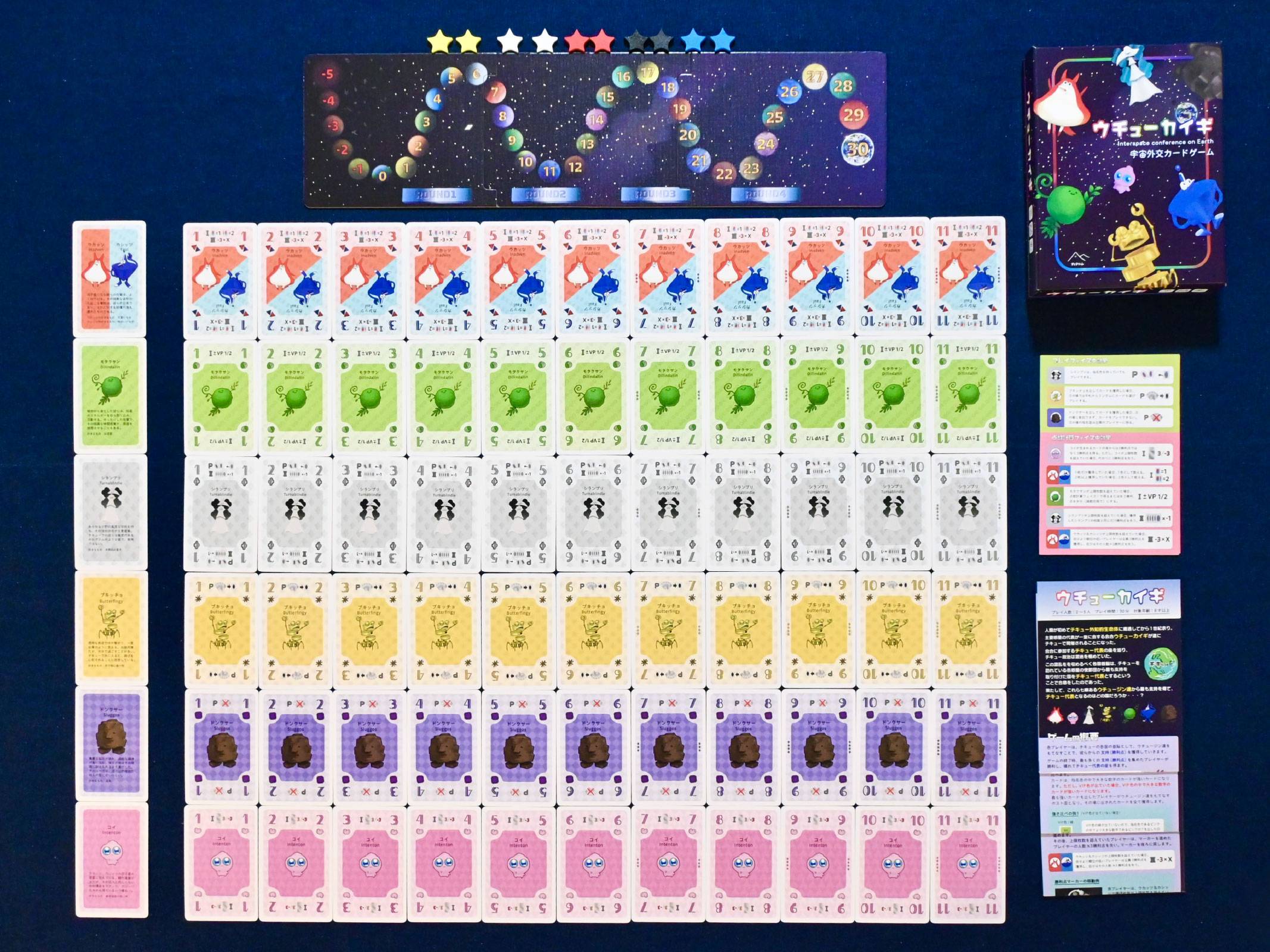 ウチュージンカード:66枚、V.I.P.指定カード:6枚、勝利点ボード:1枚、勝利点マーカー:10個(5色×各2個)、カード効果一覧:5枚、説明書:3枚