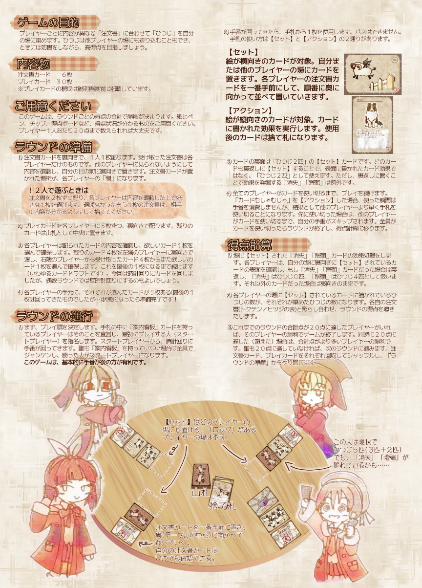 プレイヤーはそれぞれ内容が違う注文書を受け取り、注文に沿うようにひつじを集めます。