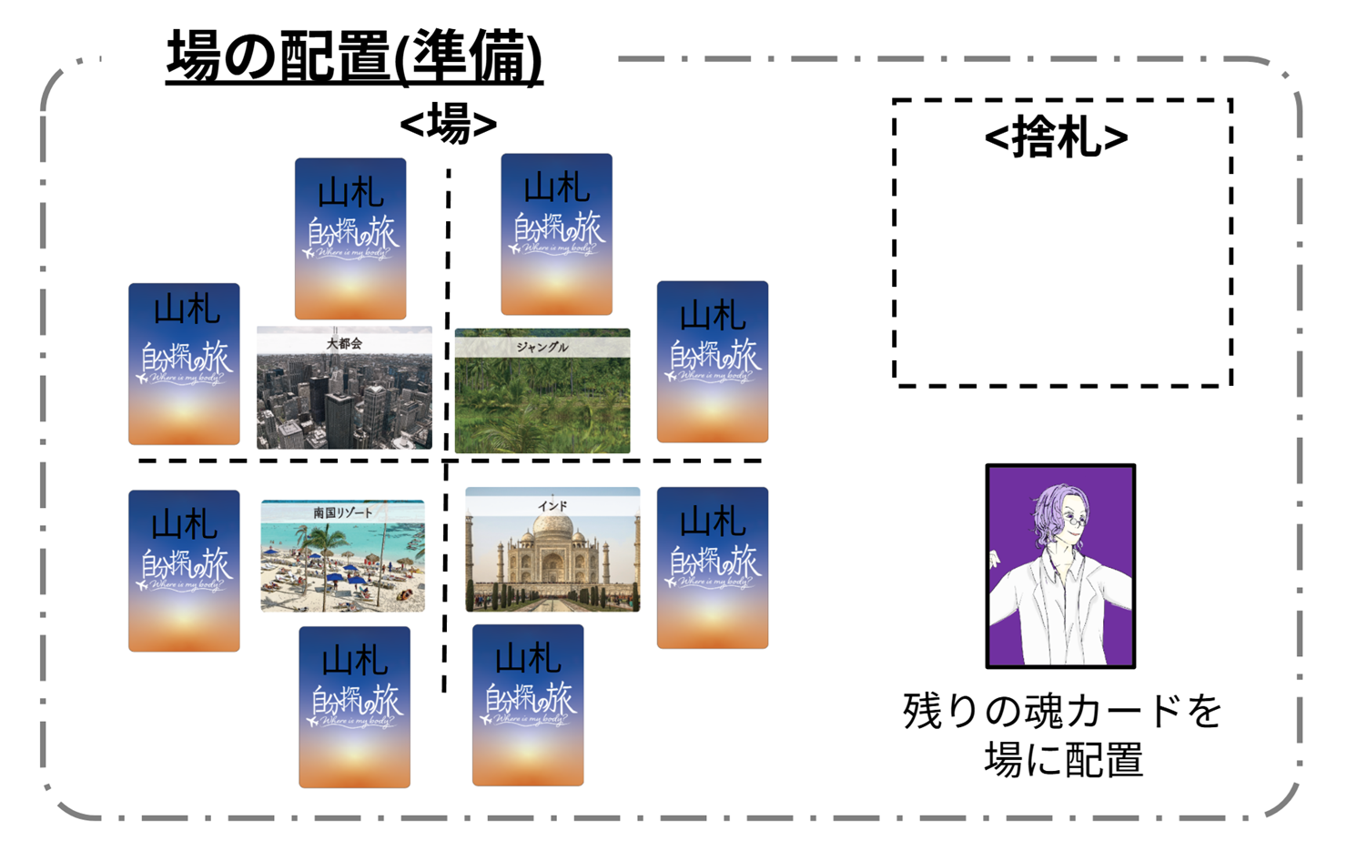 場にふせられた山札を探索していき、配られたキャラクターの魂カードと合致する体カード(右腕、左腕、右脚、左脚)を集めていくゲームです。