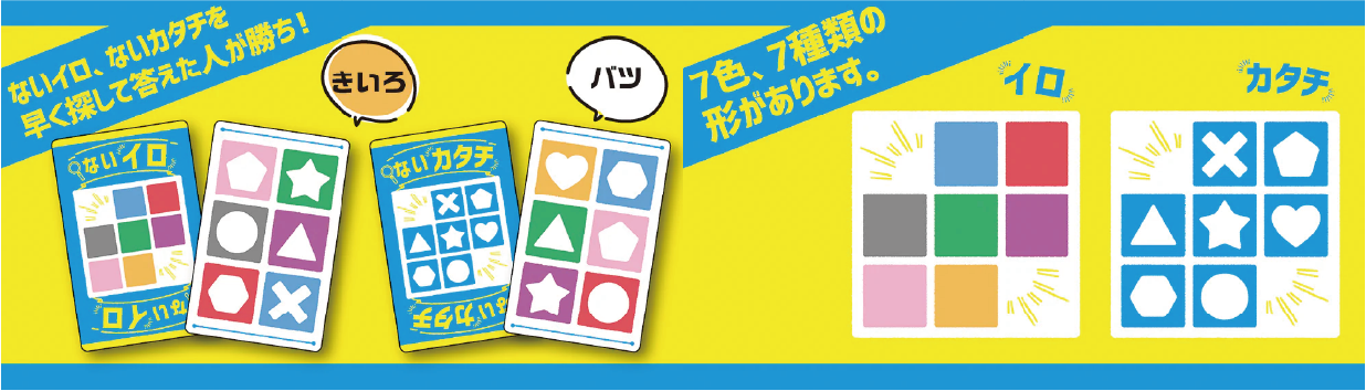 - 山札に書かれた「ないイロ」もしくは「ないカタチ」を探していち早く答える。(「三角!」や「青色!」など)