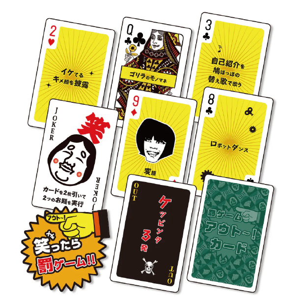 2・お題を実行したプレイヤーから笑ったと認定され「○○アウト〜!」と言われたら、アウトカードの中から1枚引いて罰ゲームを実行!