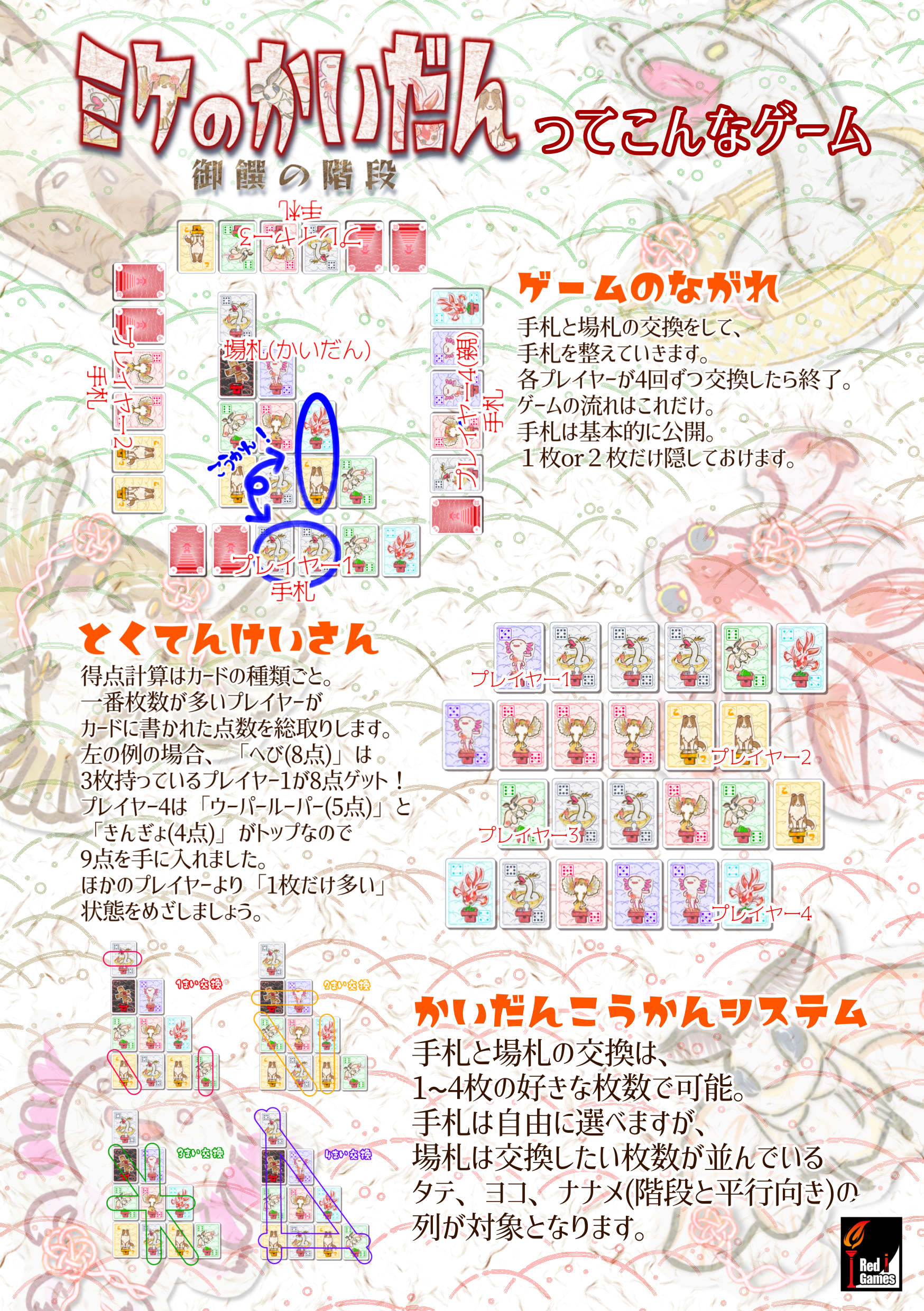 「ミケのかいだん」は神様へのお供え物をモチーフにした対戦カードゲームです。