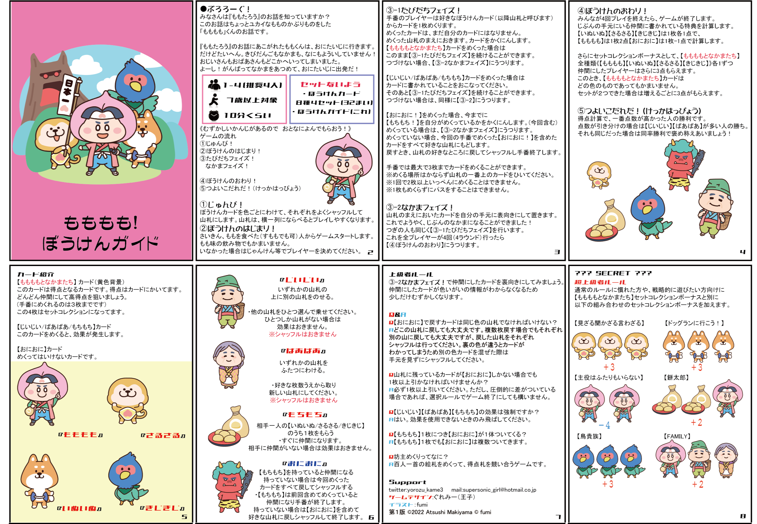 『もももも』の愉快な仲間たち『いぬいぬ』『さるさる』『きじきじ』を山札からめくり仲間にすることで得点となります。