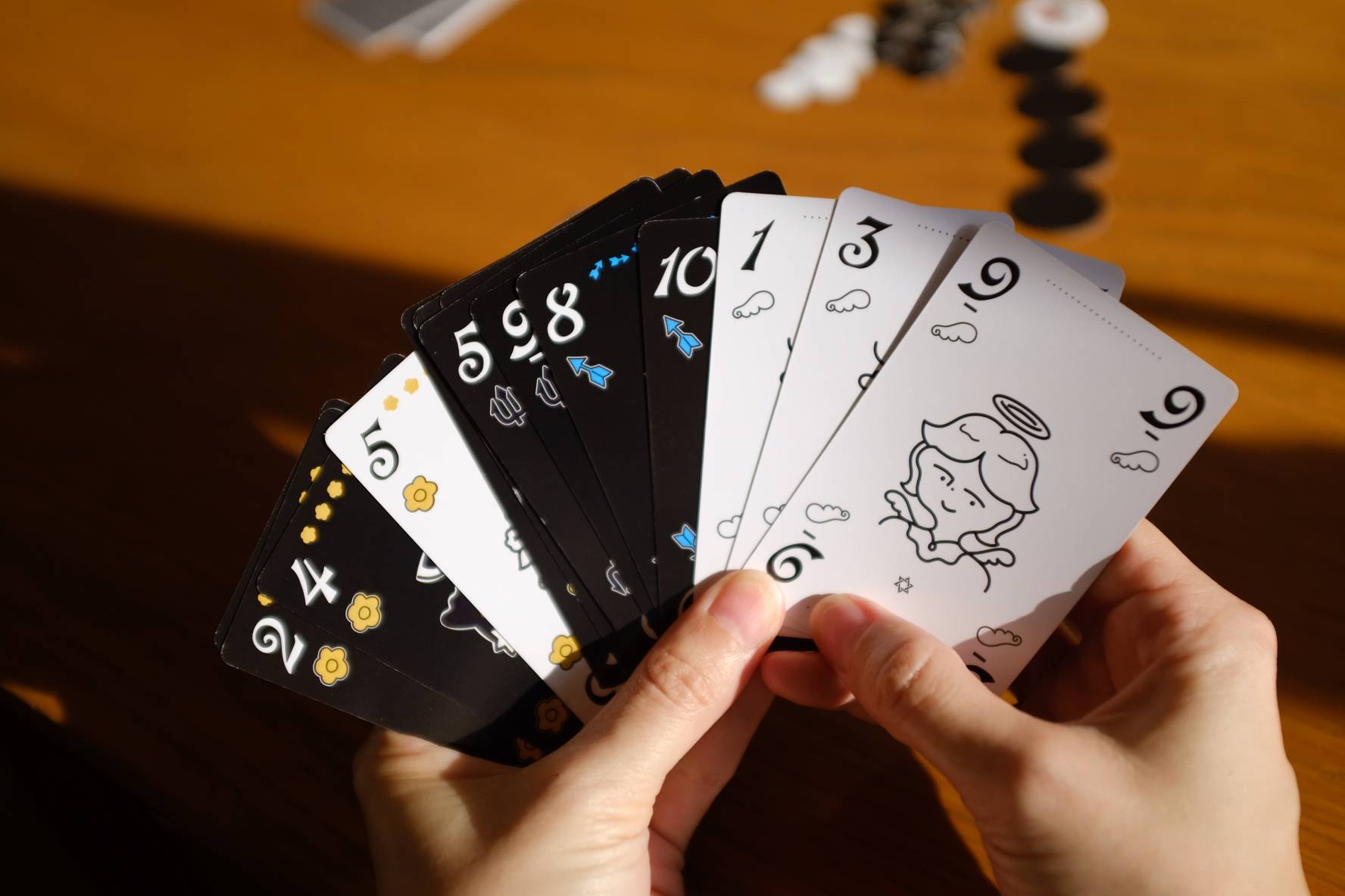 『天使と悪魔』は、自分のライフを守りつつ、相手のライフを削っていくトリックテイキングゲームです。