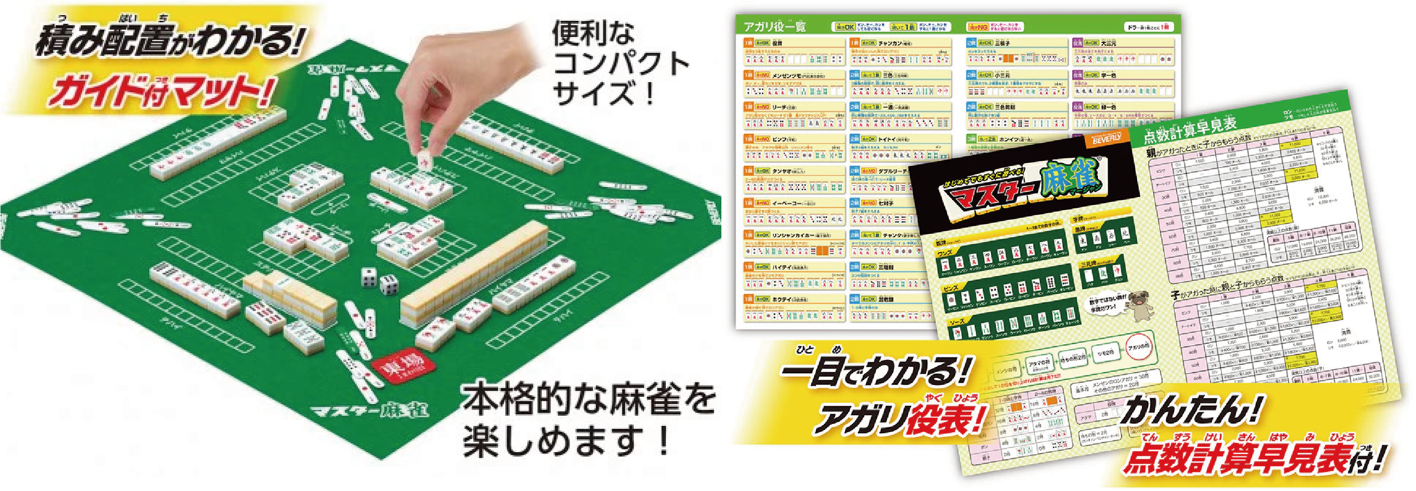 数字入り牌、数字入り点棒、ガイド付きマット、上がり役表、点数計算早見表など、初心者にもわかりやすい機能満載で、遊びながらルールが覚えられる。簡単スタートブック付き。