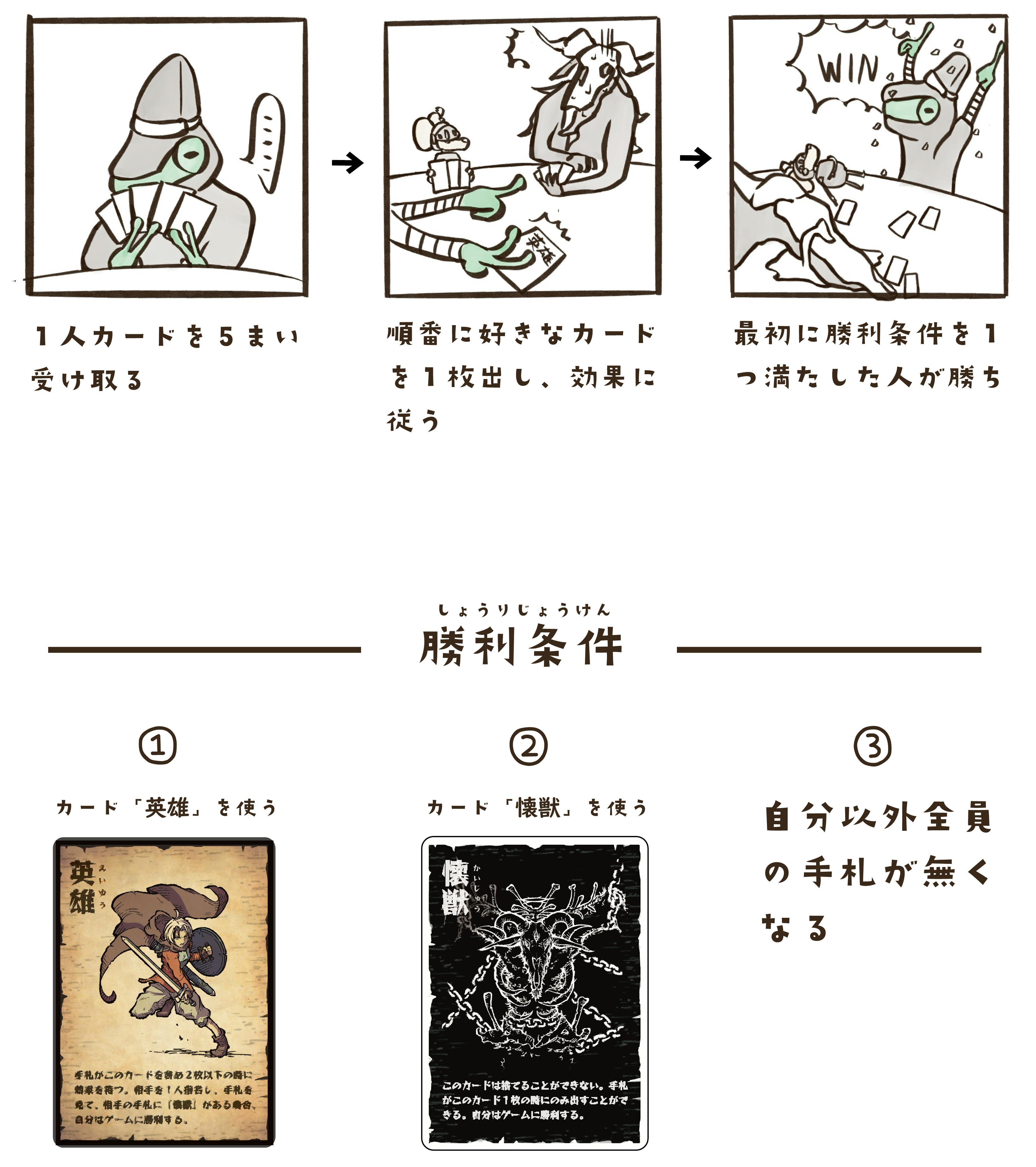 - 初心者でも簡単!シンプルなゲーム設計 使うものはカードのみ。自分の手番に、カードを出して、効果を使うだけ!