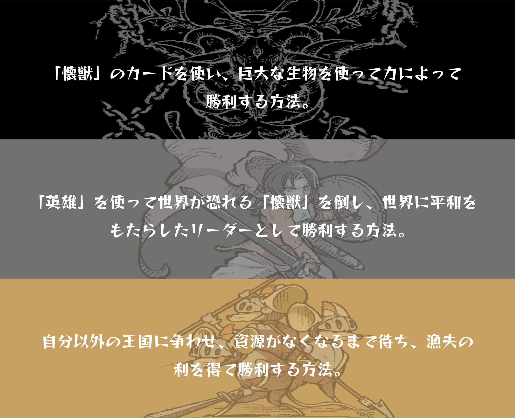- ストーリーの展開は君次第!作りこまれた世界観 3種類のどの勝ち方を選び、どのカードを使うのか。君だけのストーリーを作り上げろ!