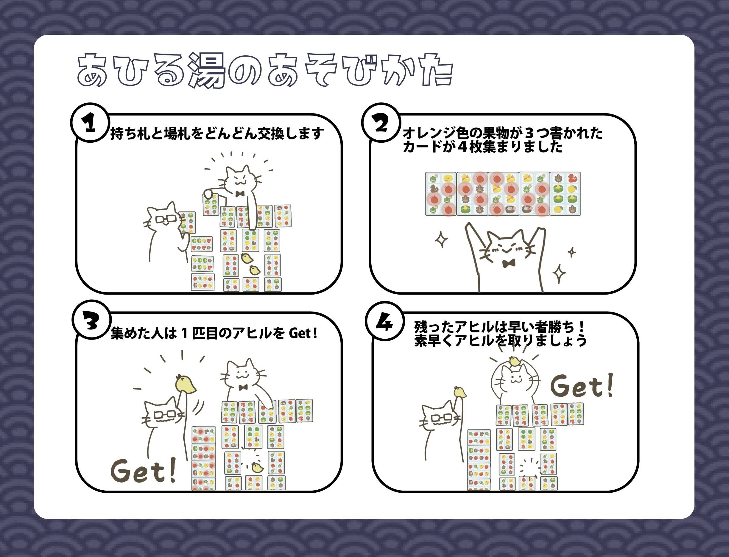 - 同じ絵柄が同じ数書かれたカードを4枚集めてアヒルチャンス! 目当てのカードが取られる前にカードをどんどん交換しよう