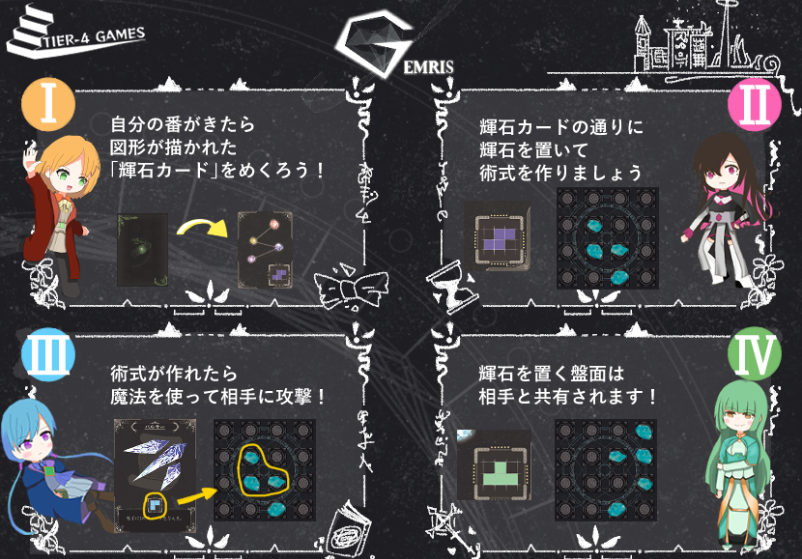 "GEMRIS" は魔術を駆使して対戦相手を倒すことが目的の2人専用対戦パズルゲームです。
