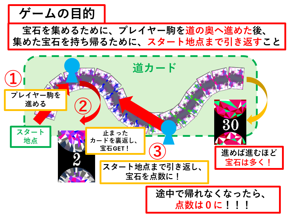 宝石を集めるために、プレイヤー駒を道の奥へ進めた後、集めた宝石を持ち帰るために、スタート地点まで引き返すこと