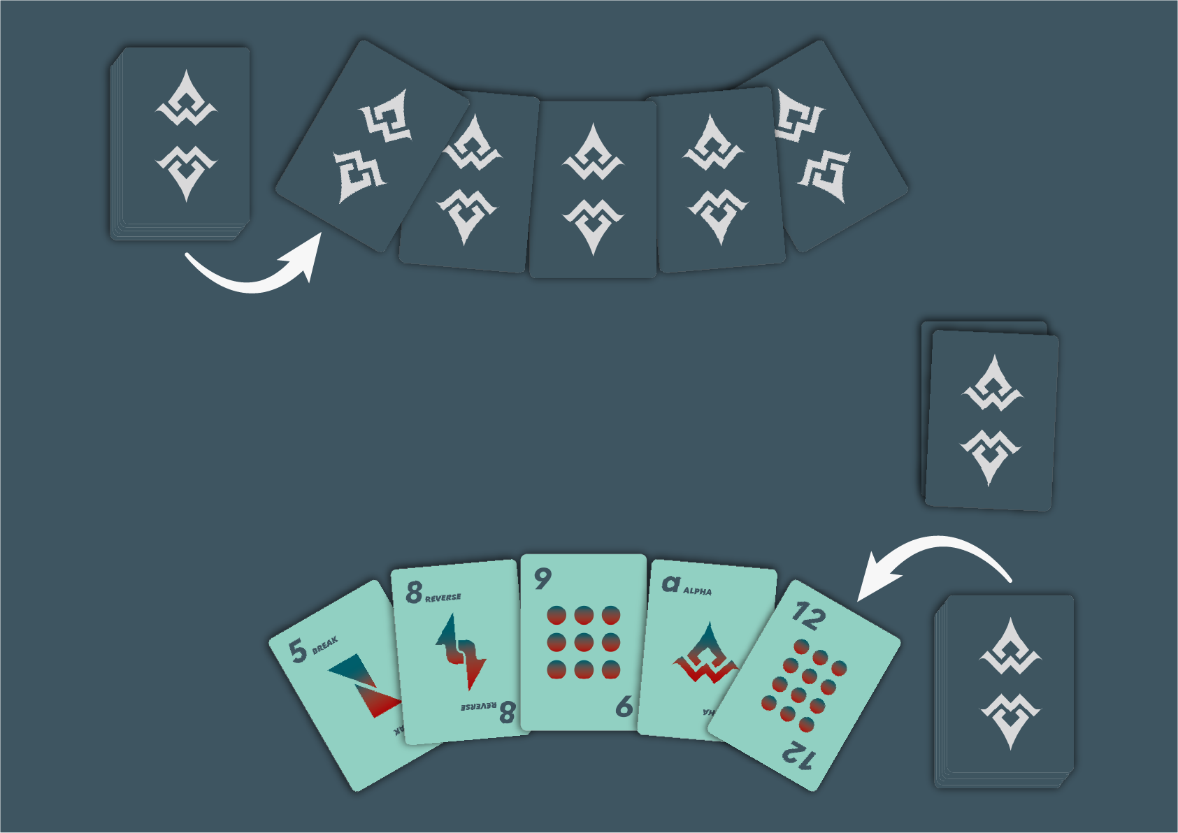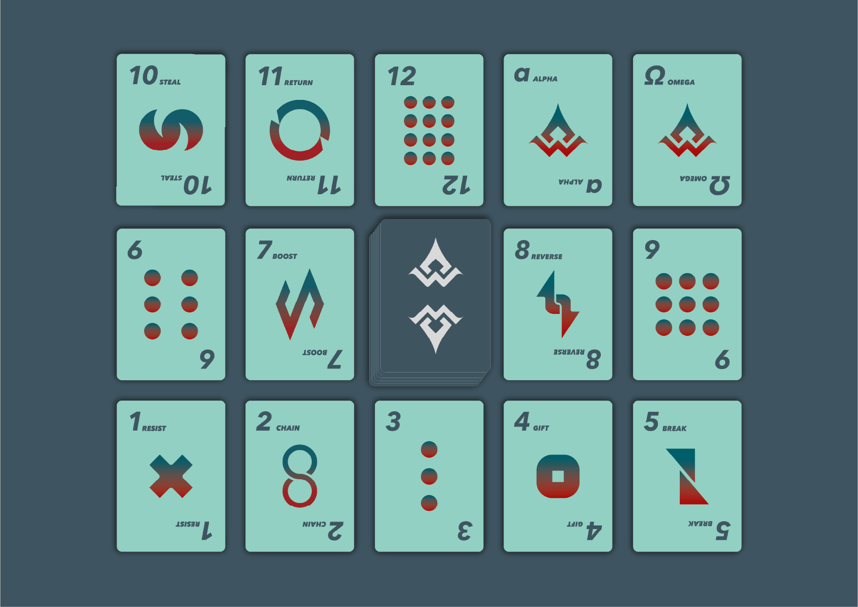 1. 各プレイヤーは、1〜12の数字カードと特殊カード(α・Ω)を含む28枚の山札を用意します。